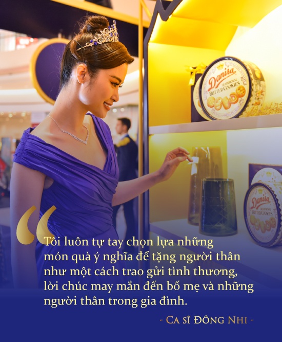 “Mỗi dịp lễ khác nhau sẽ có những món quà khác nhau, nhưng cứ đến Tết, mình lại chọn bánh quy bơ như một món quà ý nghĩa gửi đến ba mẹ, người thân trong gia đình. Với gia đình mình, thưởng thức bánh quy bên những tách trà ấm đã trở thành một nét văn hoá, một thú vui tao nhã trong ngày Tết sum vầy. Dạo một vòng ‘Lễ hội quà tặng hoàng gia Danisa’, mình chọn được bộ quà tặng Quan tâm và Tôn kính để gửi tặng cho gia đình hai bên”, ca sĩ Đông Nhi chia sẻ.