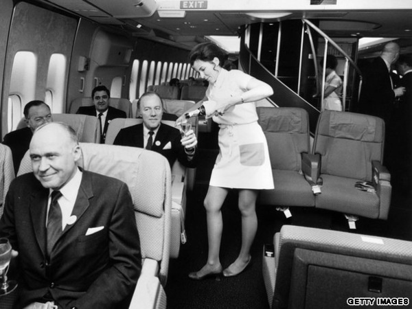 | Hình ảnh tiếp viên của Pan Am đang phục vụ đồ uống năm 1970. Các chuyến bay lúc này không chỉ có các phi hành đoàn ăn mặc gợi cảm mà còn là cơ hội cho hành khách ăn diện. |