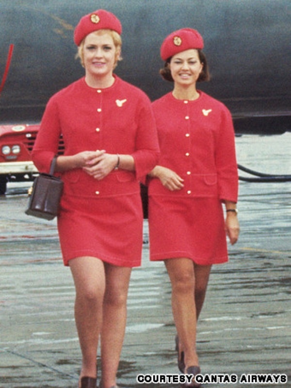 | Đồng phục của Qantas Airways hồi những năm 1964-1969. Đây là khoảng thời gian mà các hãng hàng không chọn thêm nhiều gam màu mới để làm nổi bật dàn tiếp viên của họ. |