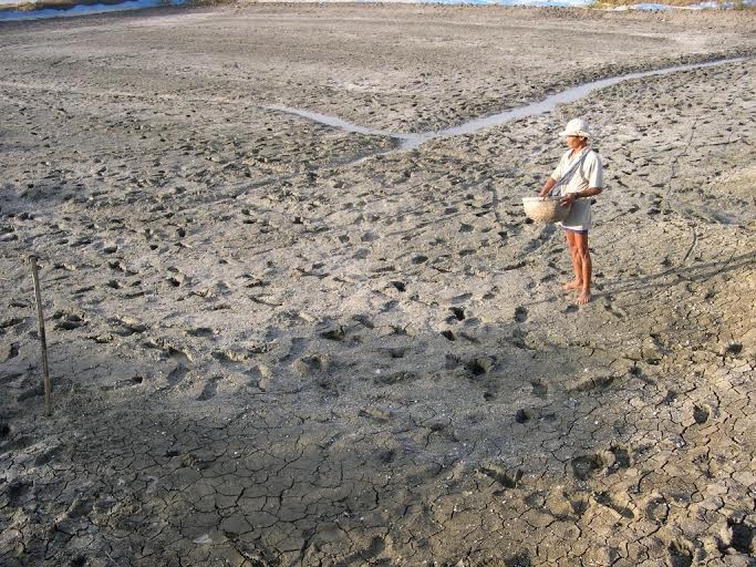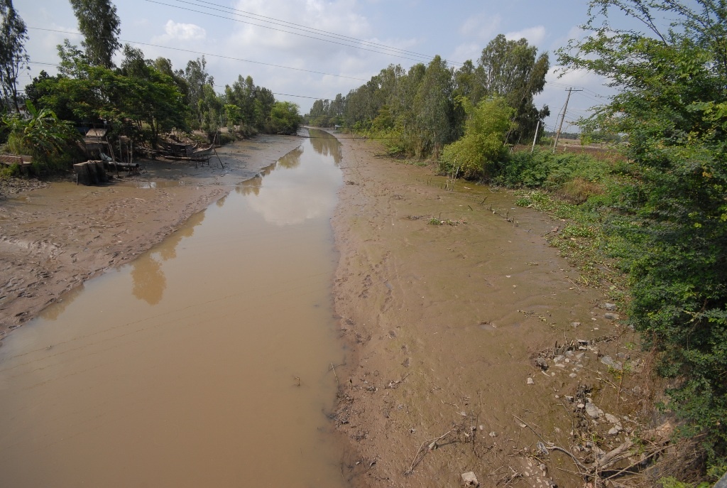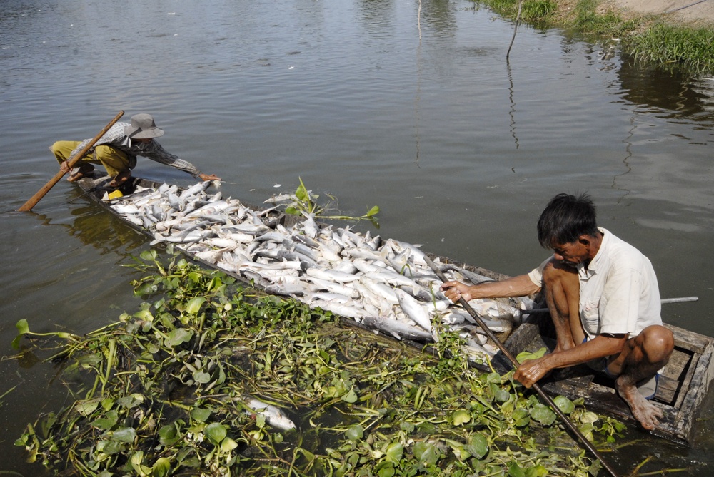 Hiện nay mặn xâm nhập gần như toàn bộ các tỉnh Bến Tre, Trà Vinh, Sóc Trăng, Bạc Liêu, Cà Mau. Nước mặn đã vào gần 1/2 diện tích các tỉnh Kiên Giang, một phần phía Đông tỉnh Tiền Giang và một phần tỉnh Long An. Tại thị xã Tân An (Long An) cách biển hơn 70 km, độ mặn đo được từ 10 - 12 g/l, vượt khả năng chịu đựng của cây trồng. Trong ảnh: Các nuôi của nông dân Bến Tre chết trắng kênh vì nước nhiễm mặn. |