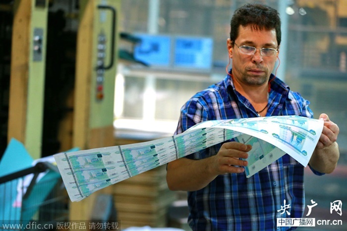Một nhân viên kiểm tra chất lượng in ấn đổng rúp Nga. |