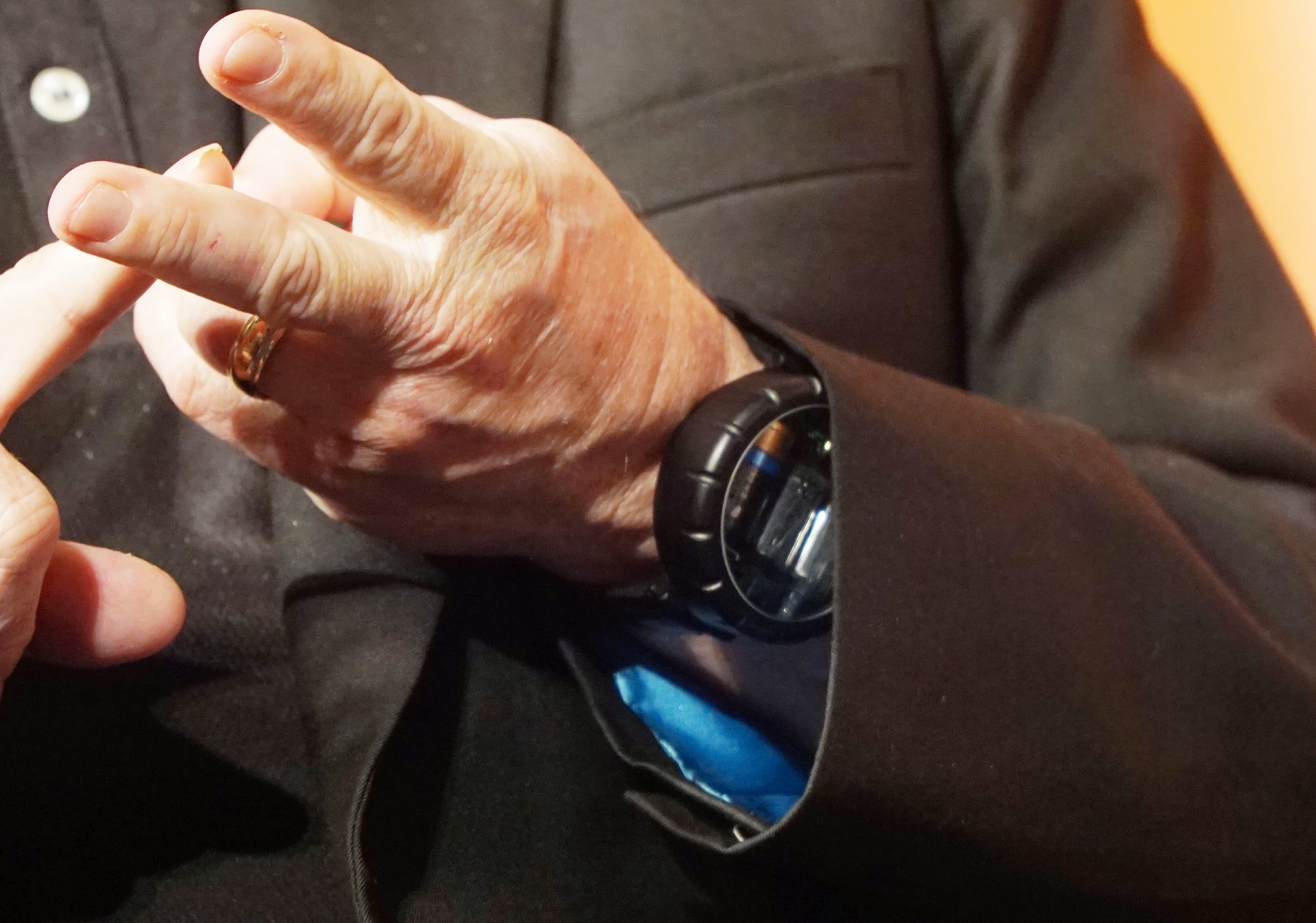 | Trên tay phải, Steve đeo Apple Watch bản dây kim loại, và tay trái của ông có thiết bị lạ. Đây không phải là chiếc đồng hồ thông thường, hay smartwatch, mà là thiết bị đeo sử dụng công nghệ từ hơn 40 năm trước. |