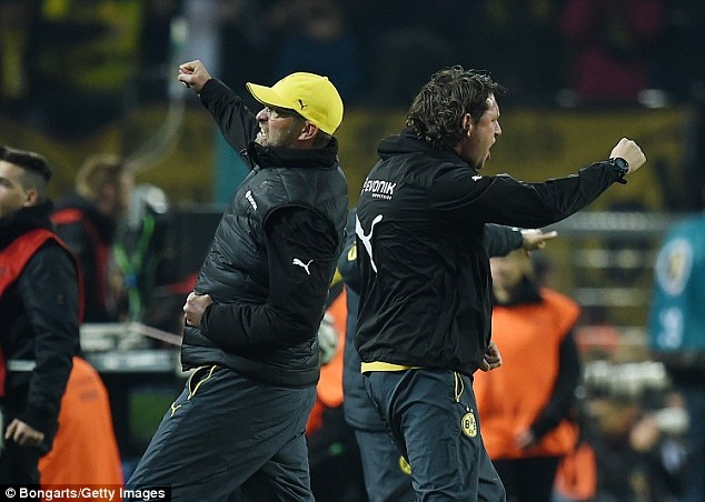 HLV Klopp và thành viên trong ban huấn luyện của Dortmund phấn khích khi đội nhà có bàn thắng.