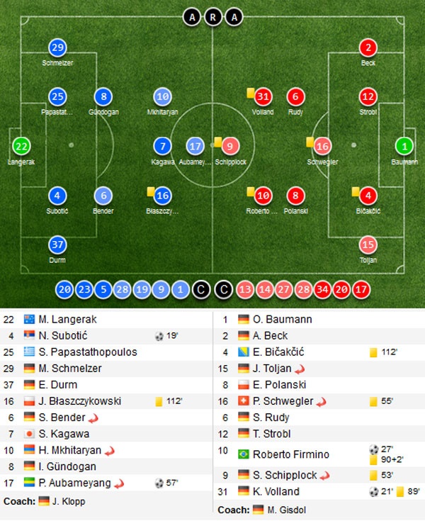 Sau khi trận tứ kết cúp quốc gia Đức diễn ra 19 phút, Subotic mở tỷ số cho Dortmund với pha dứt điểm nối từ tình huống phạt góc bên cánh phải.