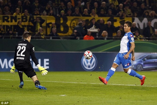Sau sai lầm của Subotic, Roberto Firmino băng xuống đối mặt với thủ môn Langerak, sau đó thực hiện cú lốp bóng nâng tỷ số lên 2-1 cho Hoffenheim ở phút 28.