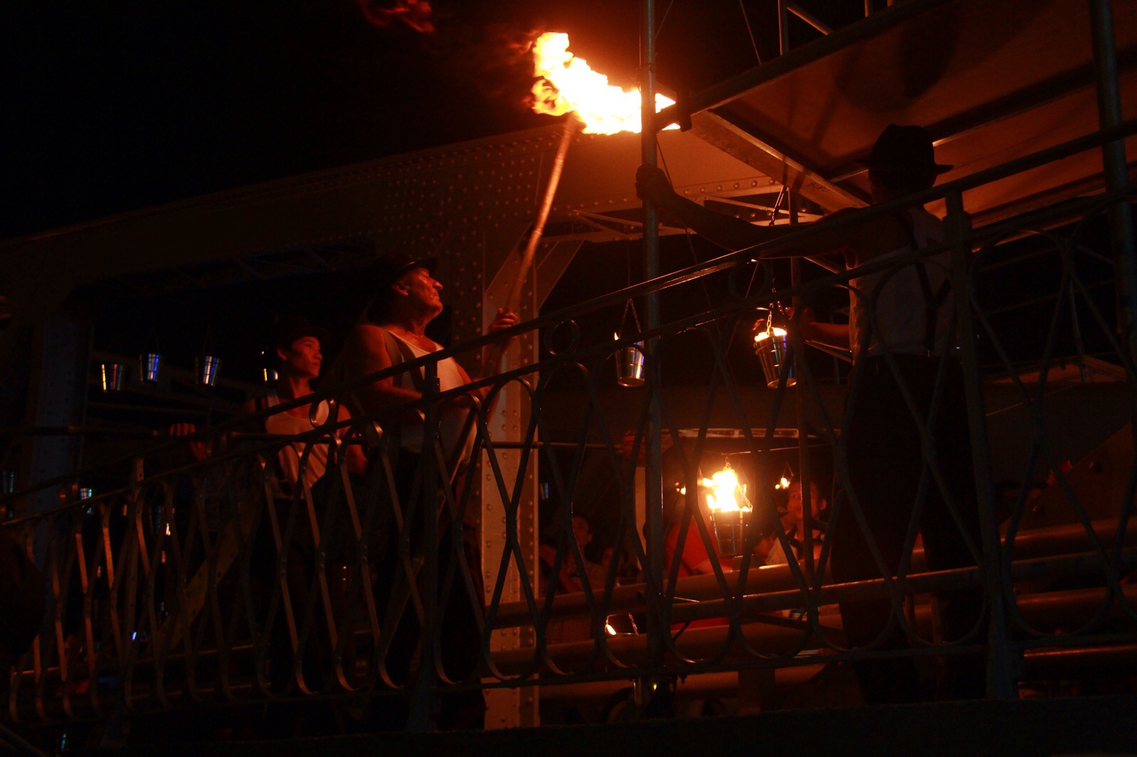 | Hai năm trước cũng tại Festival Huế, đoàn Carabosse lần đầu làm "bùng cháy" cố đô với lửa nghệ thuật ở Kỳ Đài, quảng trường Ngọ Môn, cửa Hiển Nhơn (Đại Nội) và đường Đoàn Thị Điểm. Năm nay các nghệ sĩ Pháp chuyển sang địa điểm cầu Trường Tiền. |