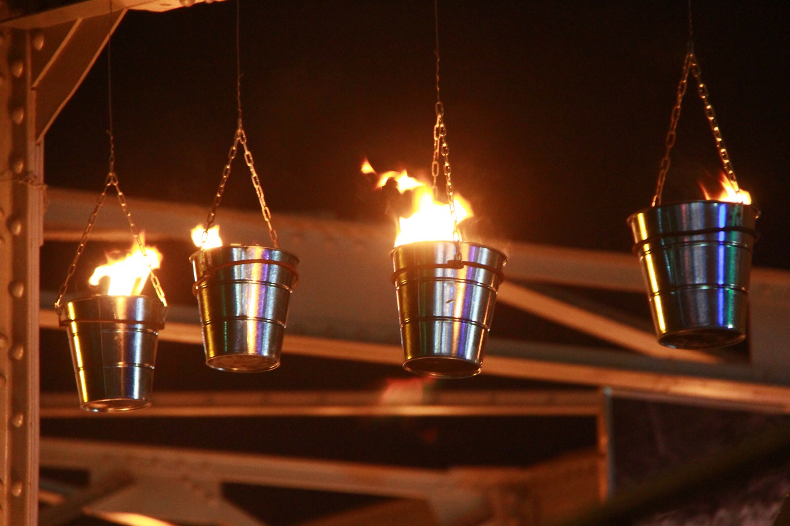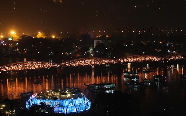| 4000 chiếc xô chứa nến và vải bên trong treo lên cao, tràn ngập cây cầu. |