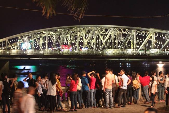 | Hàng nghìn người dân Huế đổ ra xem, họ đứng kín hai đầu cầu và bên bờ sông Hương. |