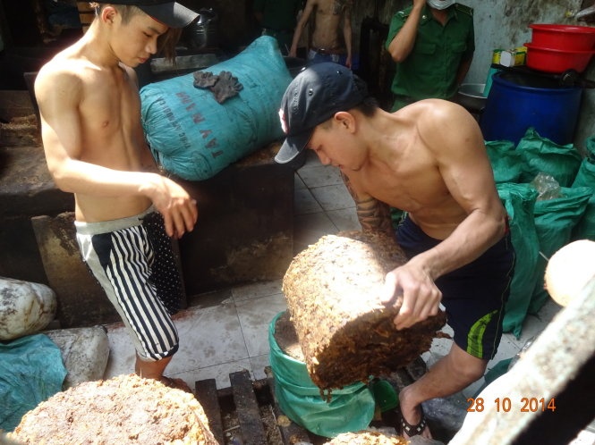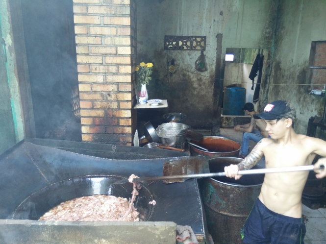 Theo các công nhân, cơ sở hoạt động được 4 tháng. Nguyên liệu mỡ, da heo thối được thu gom từ các sạp bán thịt heo ở chợ Tân Xuân và các chợ đầu mối với giá từ 5-10.000 đồng/kg. Mỡ và da heo thối gom về được bỏ vào hai nồi lớn nấu trong vòng 4 tiếng, sau đó cho vào hai khuôn sắt ép trong vòng 1 tiếng để cho ra dầu thành phẩm.