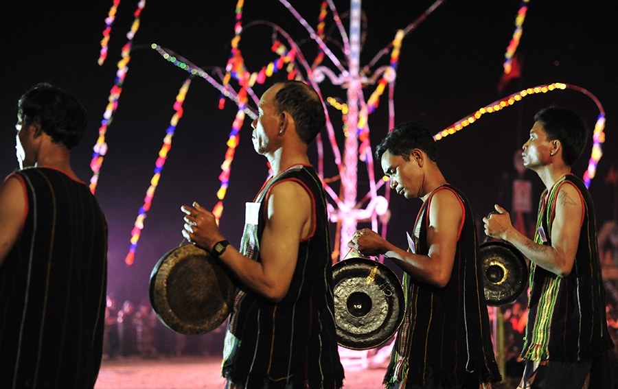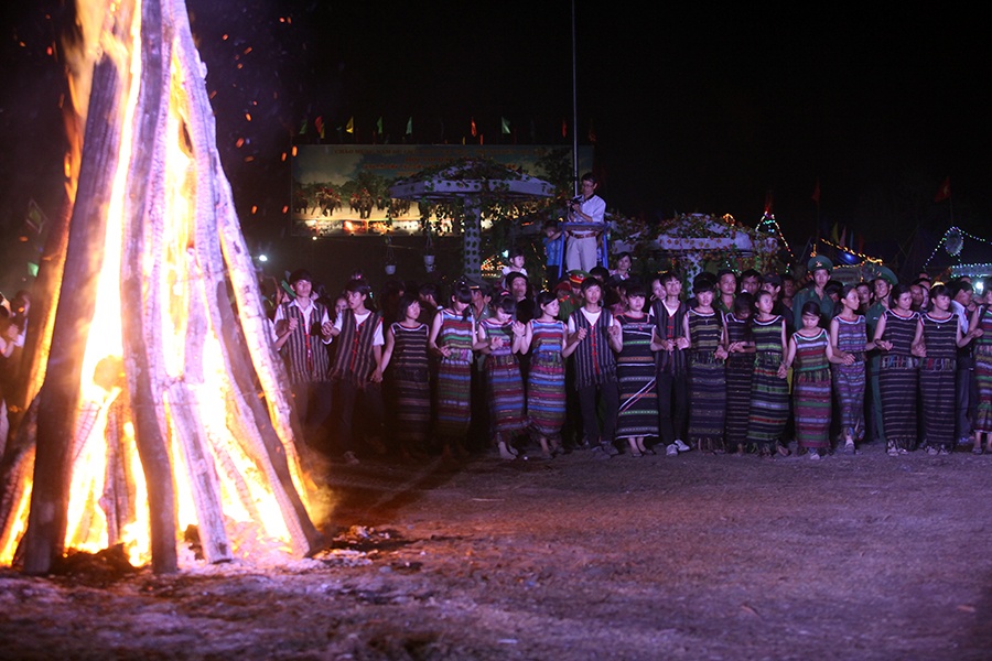 Tiếng cồng chiêng liên hồi nổi lên, những người phụ nữ, nam giới trong buôn làng cùng nắm tay nhảy vòng tròn quanh tiếng nhạc rộn ràng.