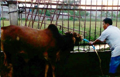 | Bò sau được bơm nước ọc ra nhiều máu, đầu chúi xuống nền xi măng vùng vẫy và tăng trọng được khoảng 10kg. |