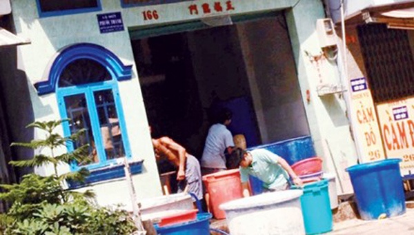 Khoảng 10 thùng nhựa bên trong đang chứa nước mà công nhân nói là “nước vôi” để giúp dừa mềm hơn và trông sạch hơn sau khi được máy cắt thành lát. Trên miệng các thùng phuy đựng dừa, ruồi bám đen đặc, gặp người đi ngang qua, ruồi bay lên từng đàn vo ve rất ghê rợn.