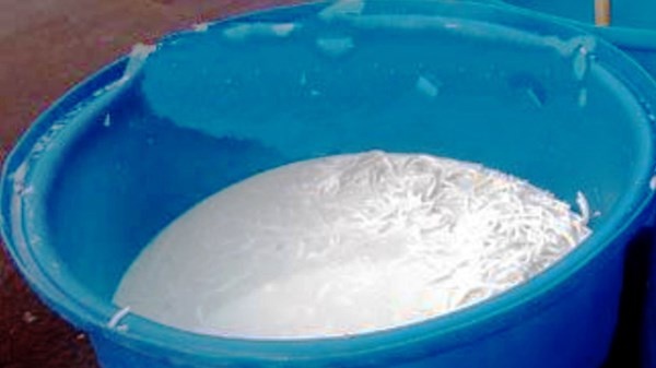 | Cơm dừa được ngâm với vôi trong các thùng nhựa để làm mềm. |