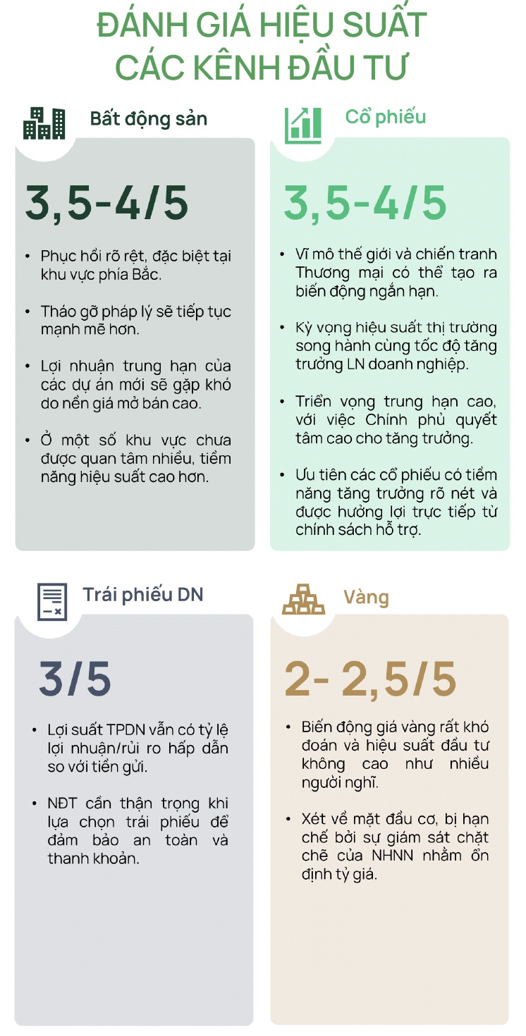 Dragon Capital cũng công bố bảng đánh giá hiệu suất của các kênh đầu tư, trong đó cổ phiếu và bất động sản được đánh giá cao về hiệu suất đầu tư, cùng đạt mức 3,5-4 điểm. Với mức điểm 3, trái phiếu được đánh giá là kênh đầu tư tốt hơn so với gửi tiết kiệm ngân hàng, song cần chú ý rủi ro và thanh khoản.