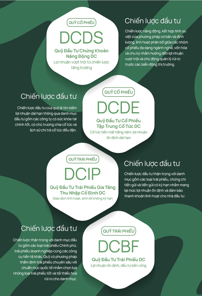 Các quỹ mở như DCIP (Quỹ Đầu tư Trái phiếu gia tăng thu nhập cố định) và DCBF (Quỹ Đầu tư Trái phiếu) được thiết kế theo hai khung thời gian đầu tư dưới 6 tháng và trên 6 tháng, phù hợp với nhà đầu tư có khẩu vị rủi ro vừa phải, mong muốn tích lũy với lợi suất cao hơn tiết kiệm và có rủi ro thấp.