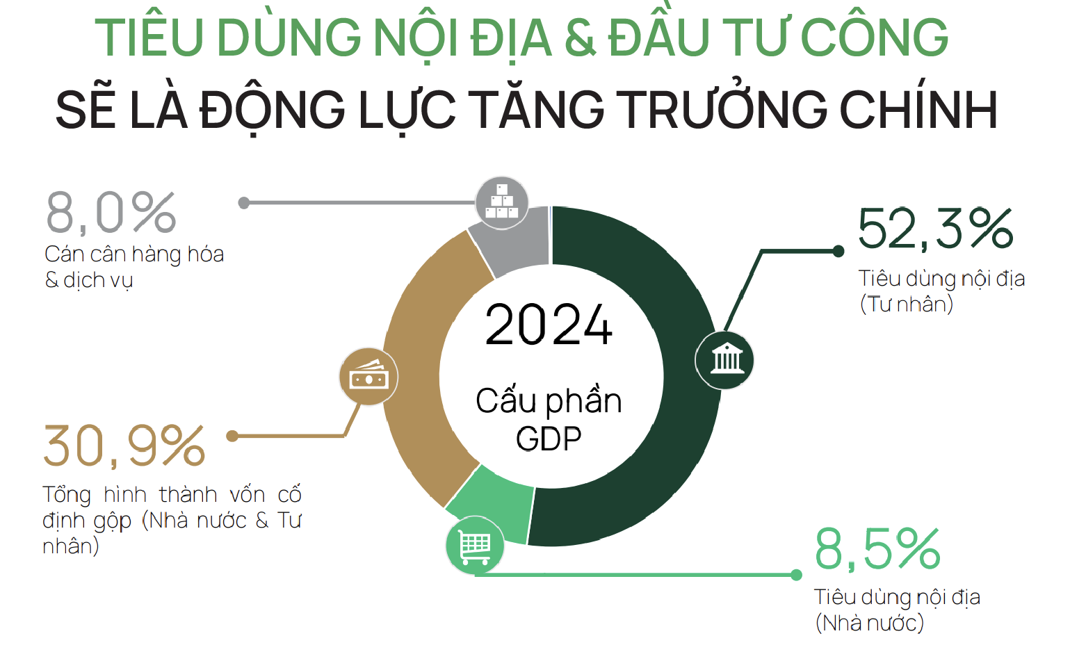 Ông Lê Anh Tuấn - Giám đốc Khối Đầu tư của Dragon Capital nhấn mạnh, tiêu dùng nội địa (chiếm hơn 60%) và đầu tư xã hội (hơn 30%) sẽ tiếp tục là 2 động lực chính trong cơ cấu tăng trưởng năm nay.