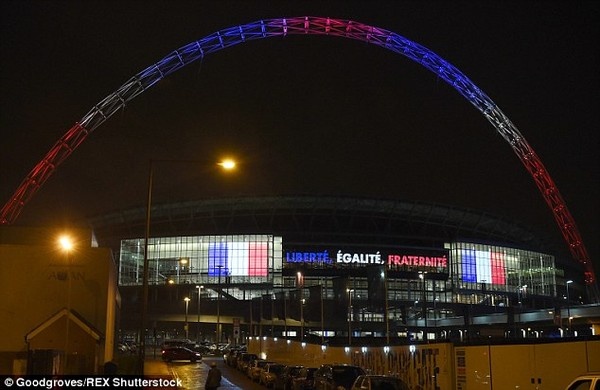 | Đèn chiếu lên phần vòm của sân Wembley đã chuyển sang màu cờ của Pháp từ sau hôm xảy ra vụ khủng bố. Màn hình LED trước sân hiển thị khẩu hiệu của nước Pháp: "Tự do - Bình đẳng - Bác ái". |