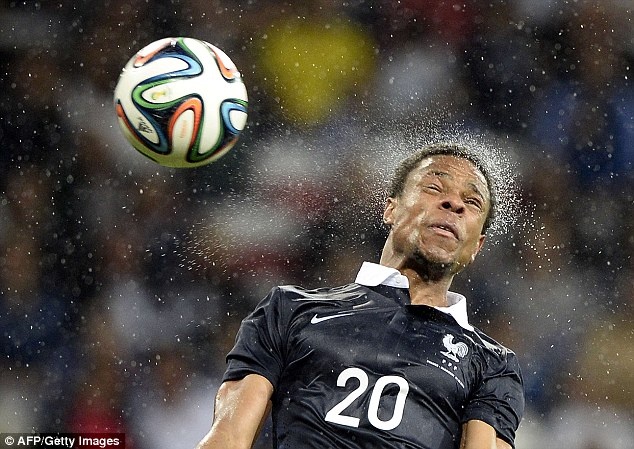 | Tiền đạo Loic Remy của ĐT Pháp nỗ lực thực hiện pha đánh đầu nhưng không thành công. |
