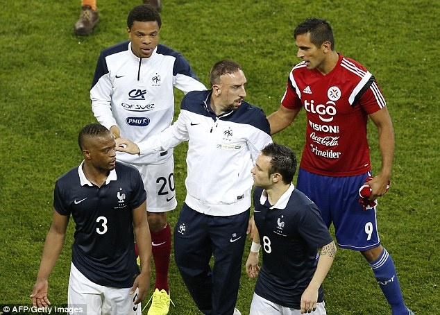 Tiền vệ Ribery động viên đồng đội sau trận hòa với ĐT Paraguay.