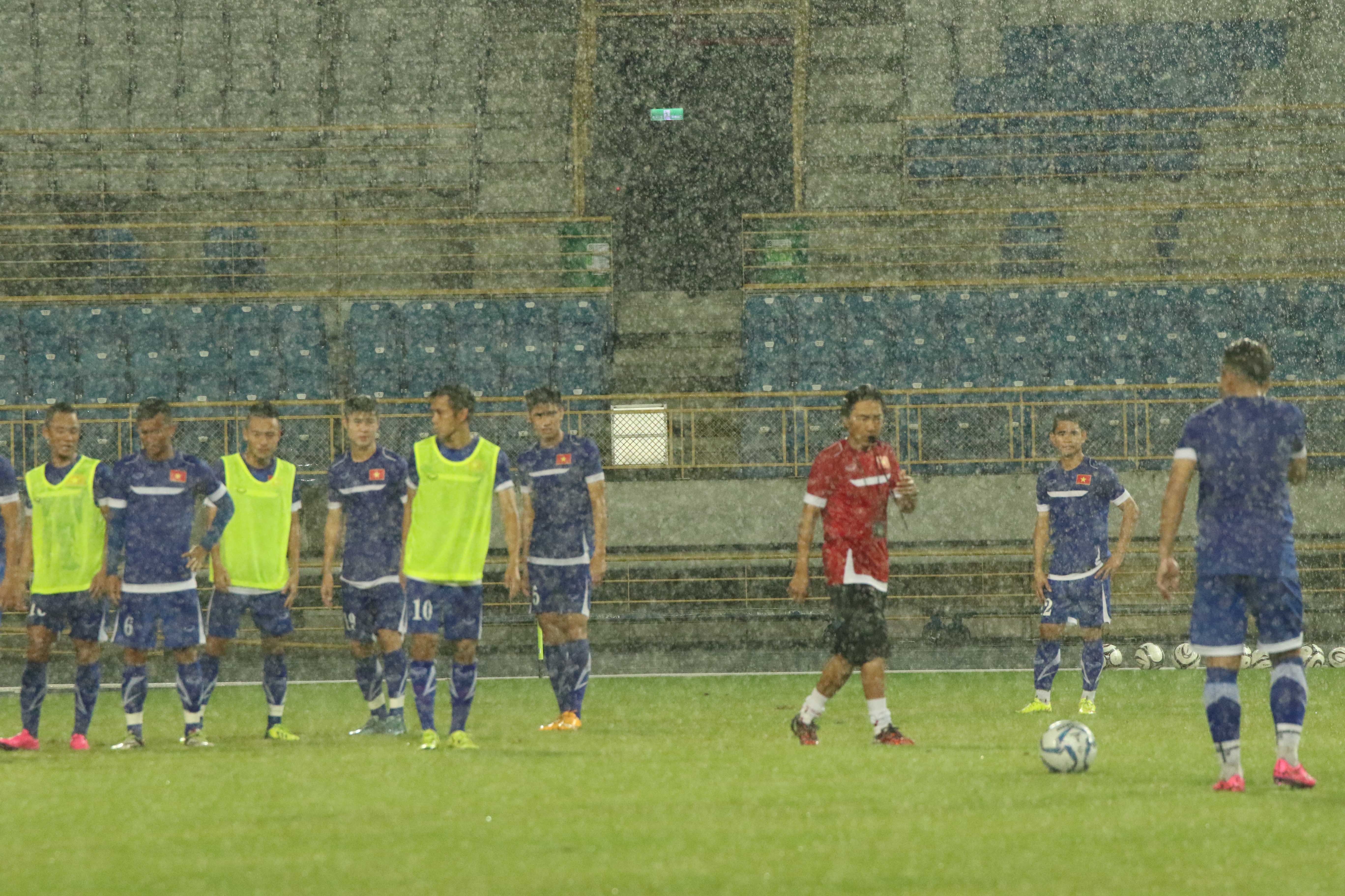 Buổi tập của ĐT Việt Nam diễn ra được 20 phút thì trời bất ngờ đổ mưa lớn. Tuy nhiên, toàn đội vẫn nỗ lực tập luyện dưới sự chỉ đạo của HLV người Nhật Bản.