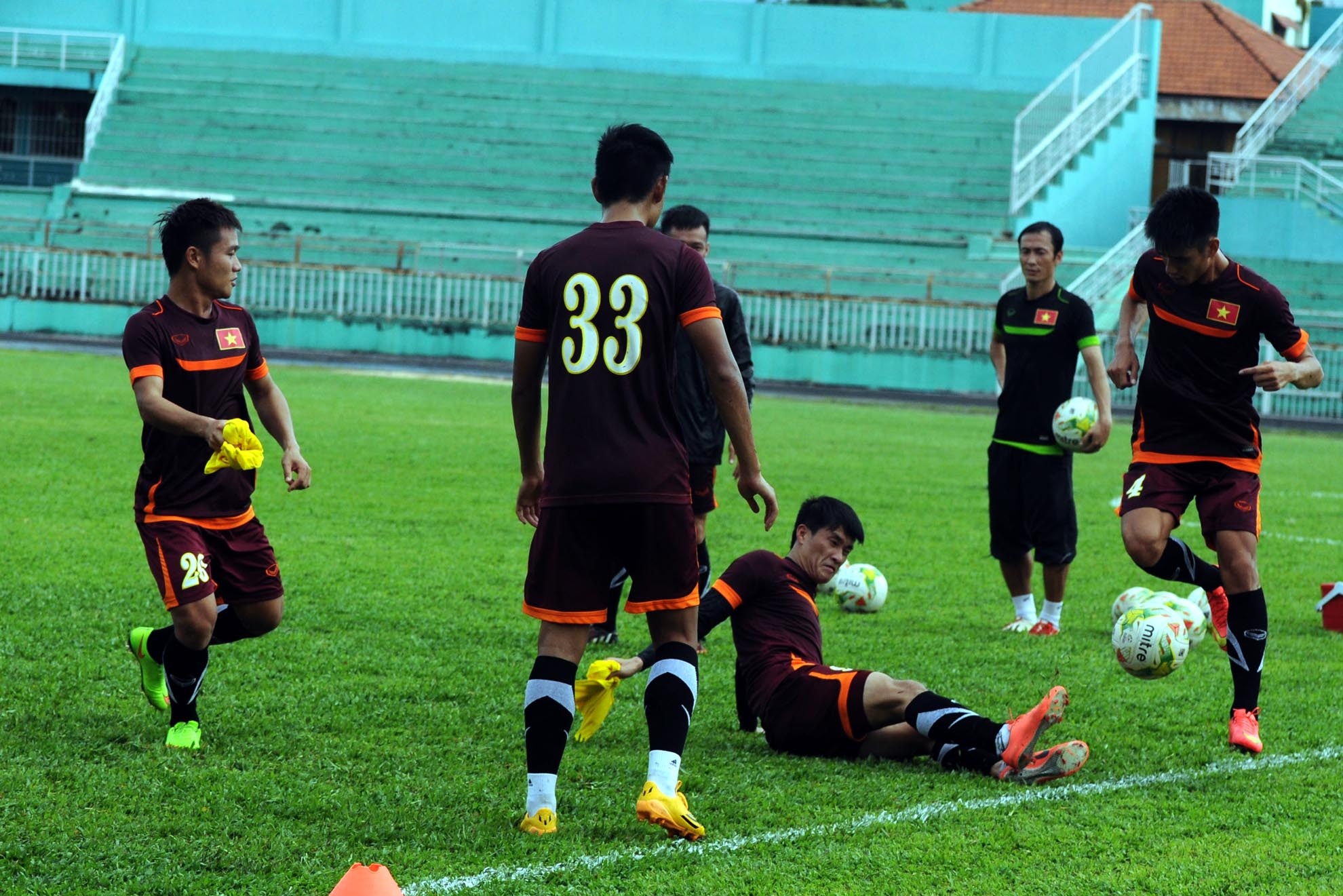 | Các cầu thủ có tâm lý thoải mái và vui vẻ trong buổi tập dù chưa thực sự quen với thời tiết thay đổi chóng vánh giữa Hà Nội (mưa rét) - Sài Gòn (nắng nóng). |