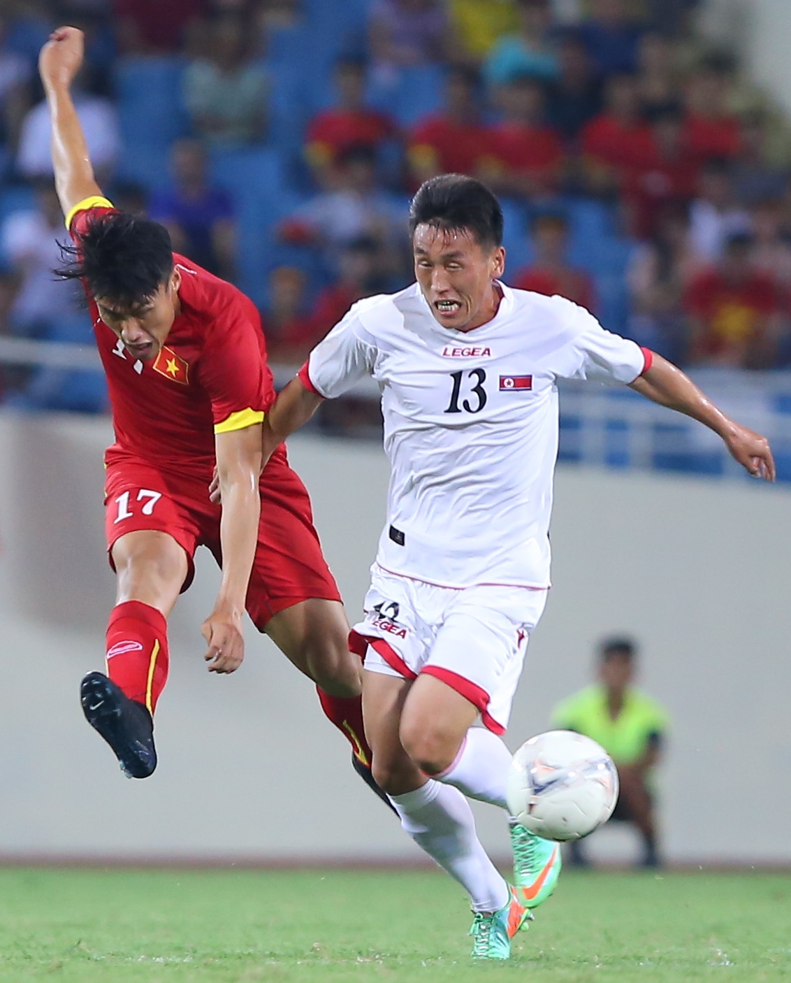 | 17 phút sau khi ĐT Việt Nam dẫn bàn, CHDCND Triều Tiên được hưởng quả penalty sau khi Huy Cường để bóng chạm tay trong khu vực 16,50 m. Nguyên Mạnh xuất sắc cản phá cú sút đầu tiên, nhưng không thể cứu thua cú đá bồi gỡ hòa 1-1 của cầu thủ Hong Kum Song. |