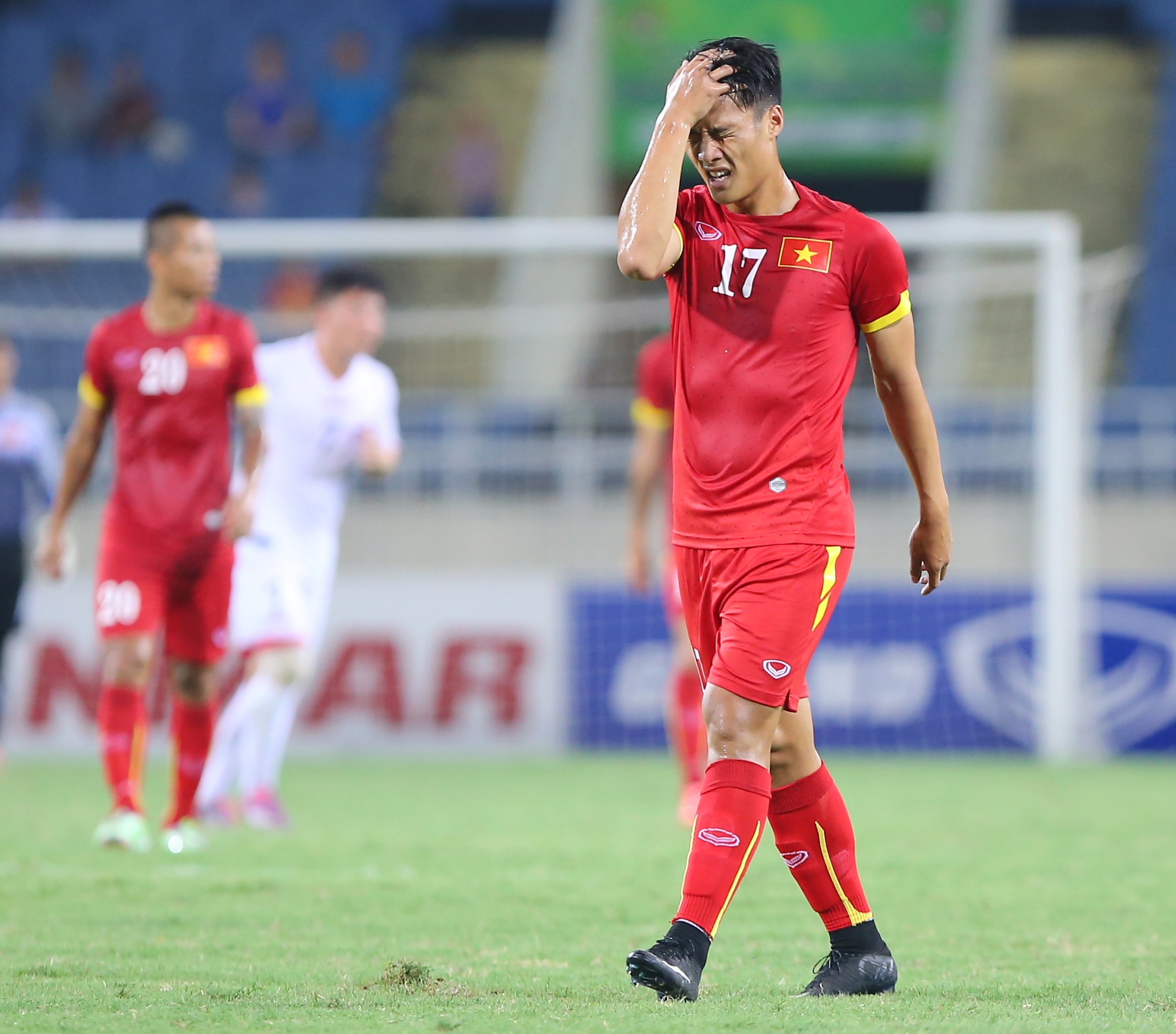 | Kết thúc 90 phút thi đấu, ĐTVN hòa CHDCND Triều Tiên với tỷ số 1-1. Mạc Hồng Quân tiếc nuối khi pha ghi bàn của mình không thể giúp đội nhà giành chiến thắng. |