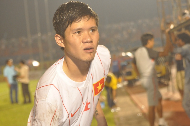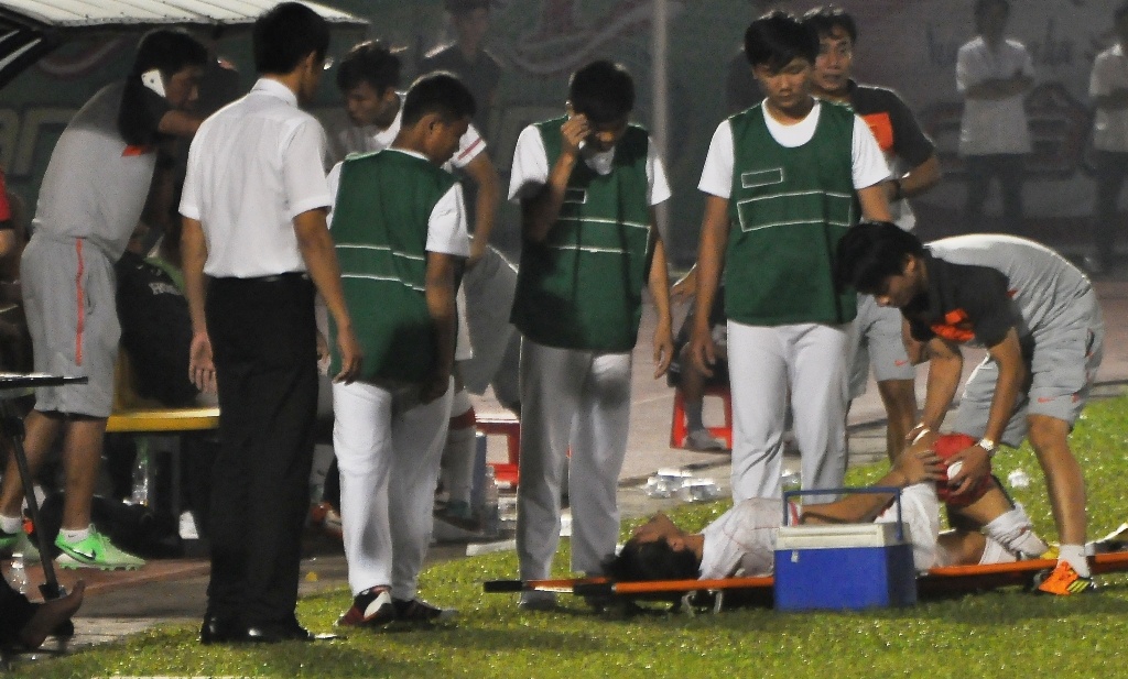| Thanh Hào sau khi được chăm sóc chỉ vào sân đá được vài phút rồi được thay bằng Ngọc Hải. |