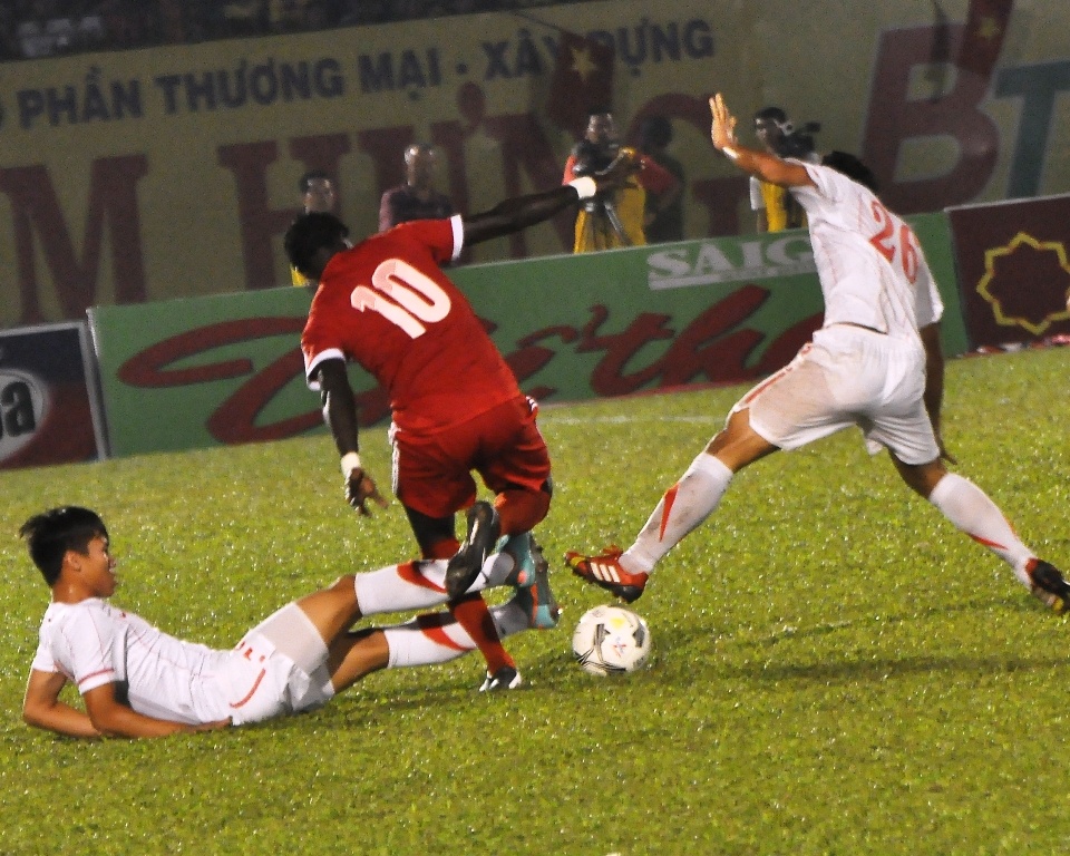 | Cầu thủ B.Bình Dương truy sát Văn Quyết. |