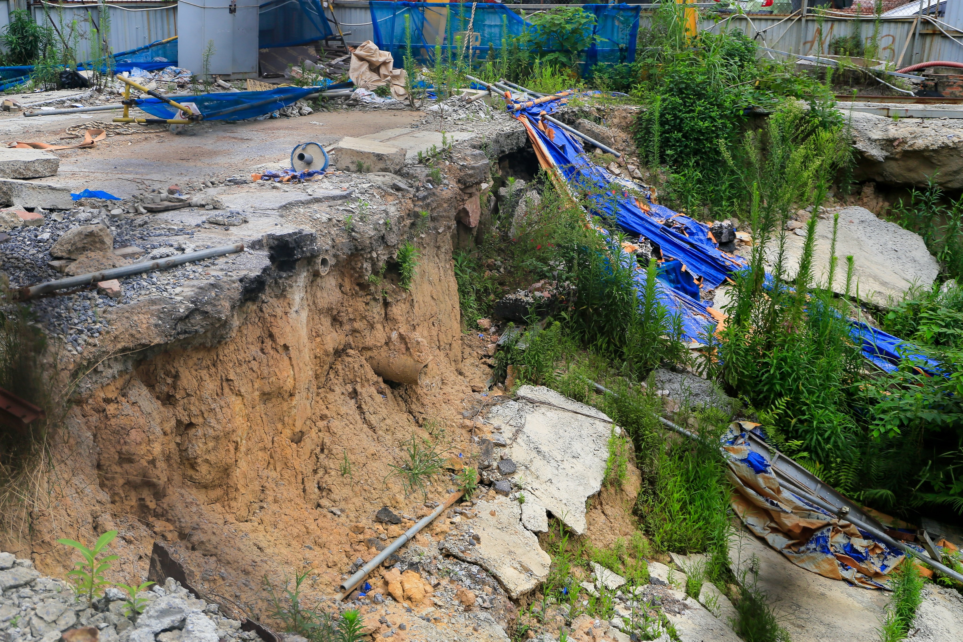 | Do đó dự án đến nay vẫn ì ạch, nhiều hố sâu được xây dựng từ trước lâu ngày không được xử lý nên thành bể chứa nước, rêu phủ một màu xanh trên các mảng tường. |