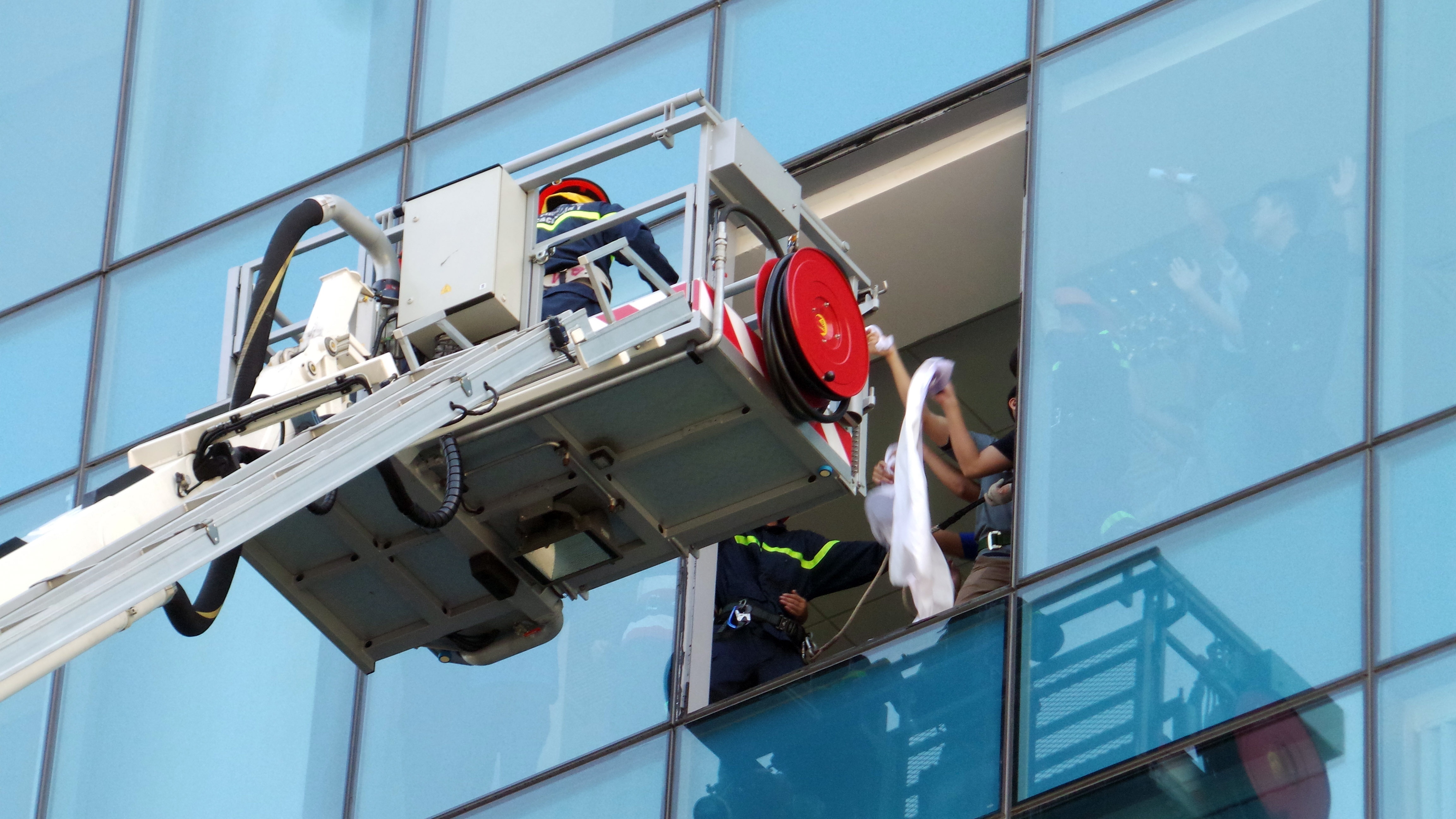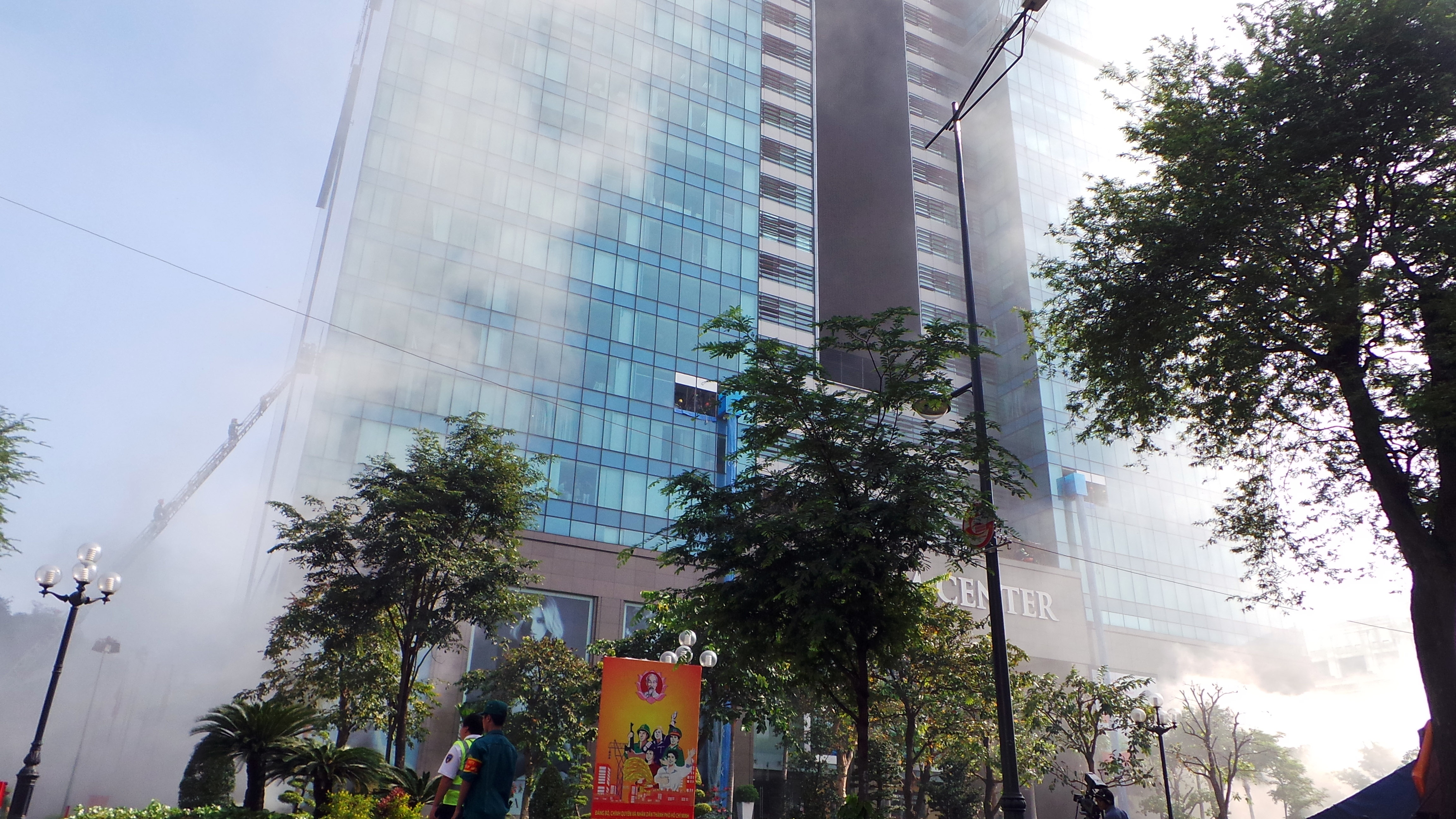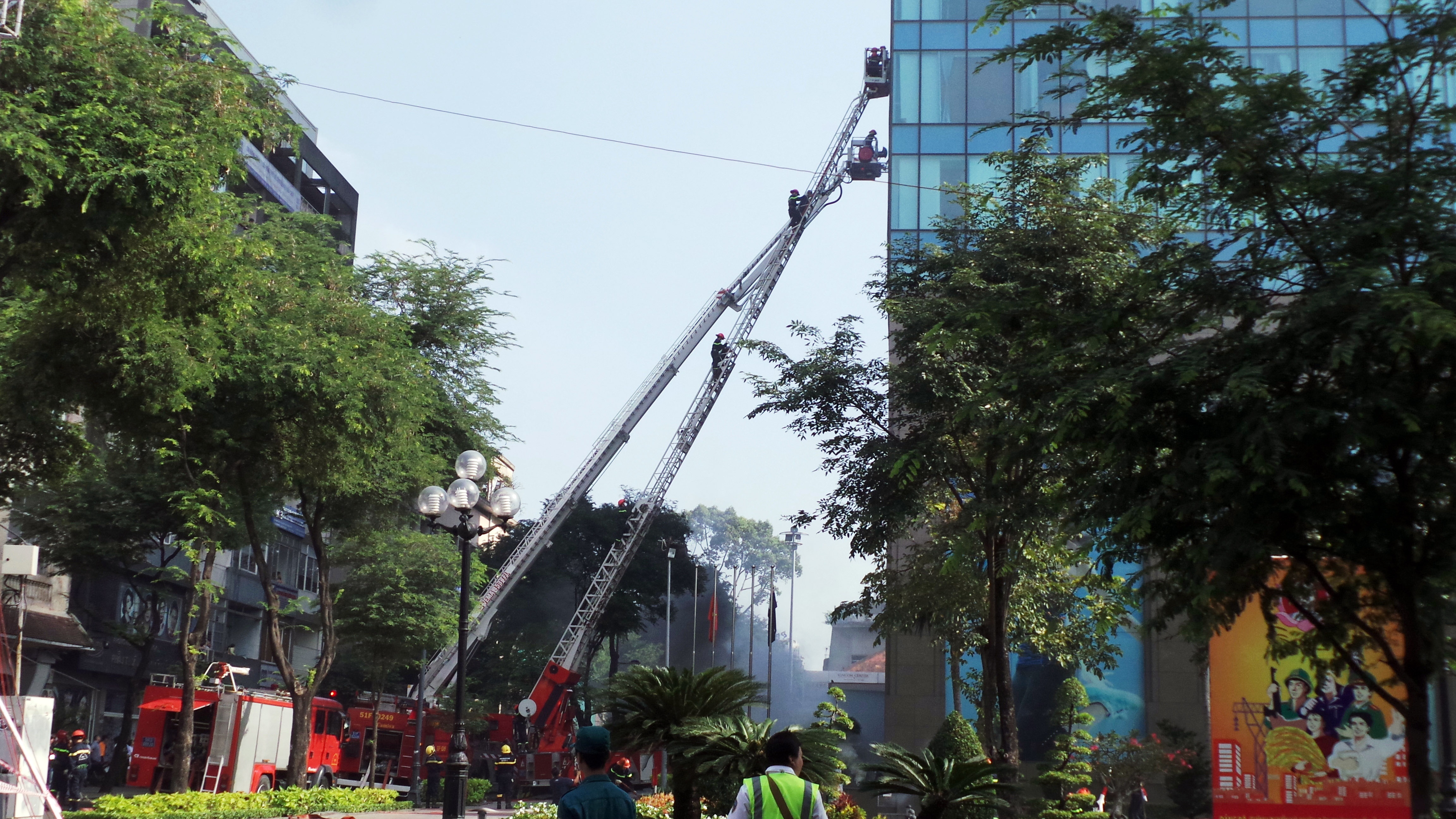 | Nhiều xe thang tiếp cận, cứu người hoảng loạn tập trung tại tầng 7. |
