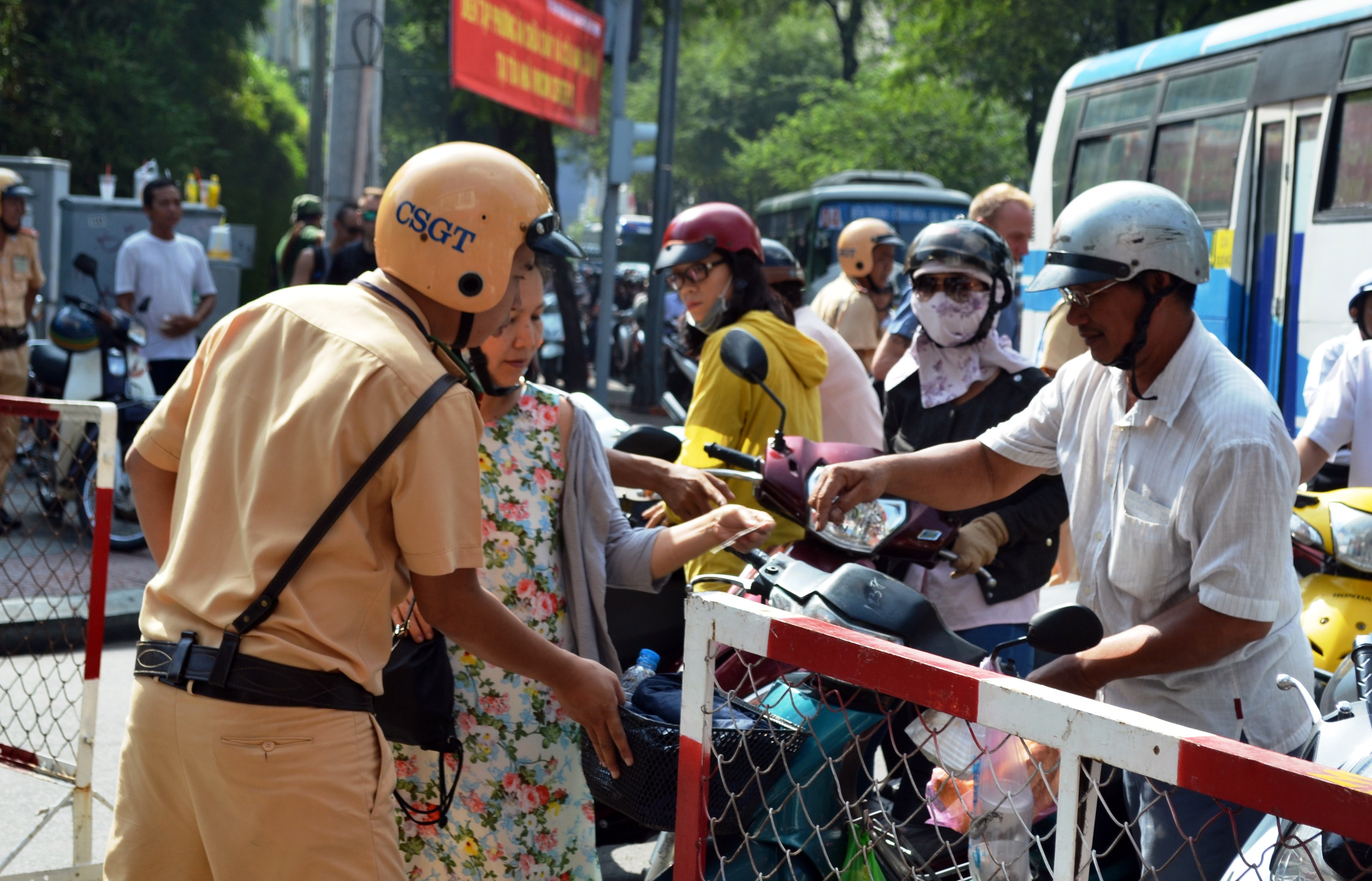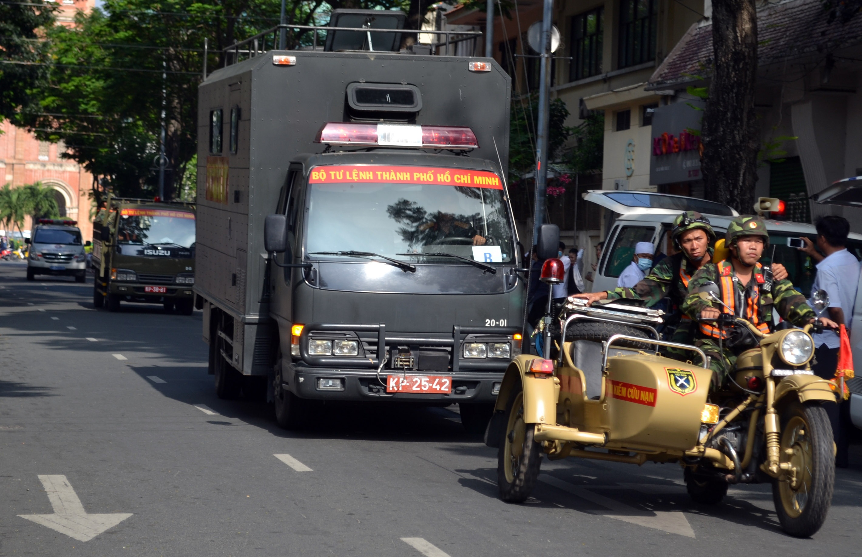 | Tại những khu vực cấm đường trên Đồng Khởi, Lý Tự Trọng, Lê Thánh Tôn, người dân gặp khó khăn khi muốn vào khu vực đang diễn tập. Những người muốn vào phải xuất trình giấy tờ chứng minh có nhà ở hoặc làm việc trong khu vự. |