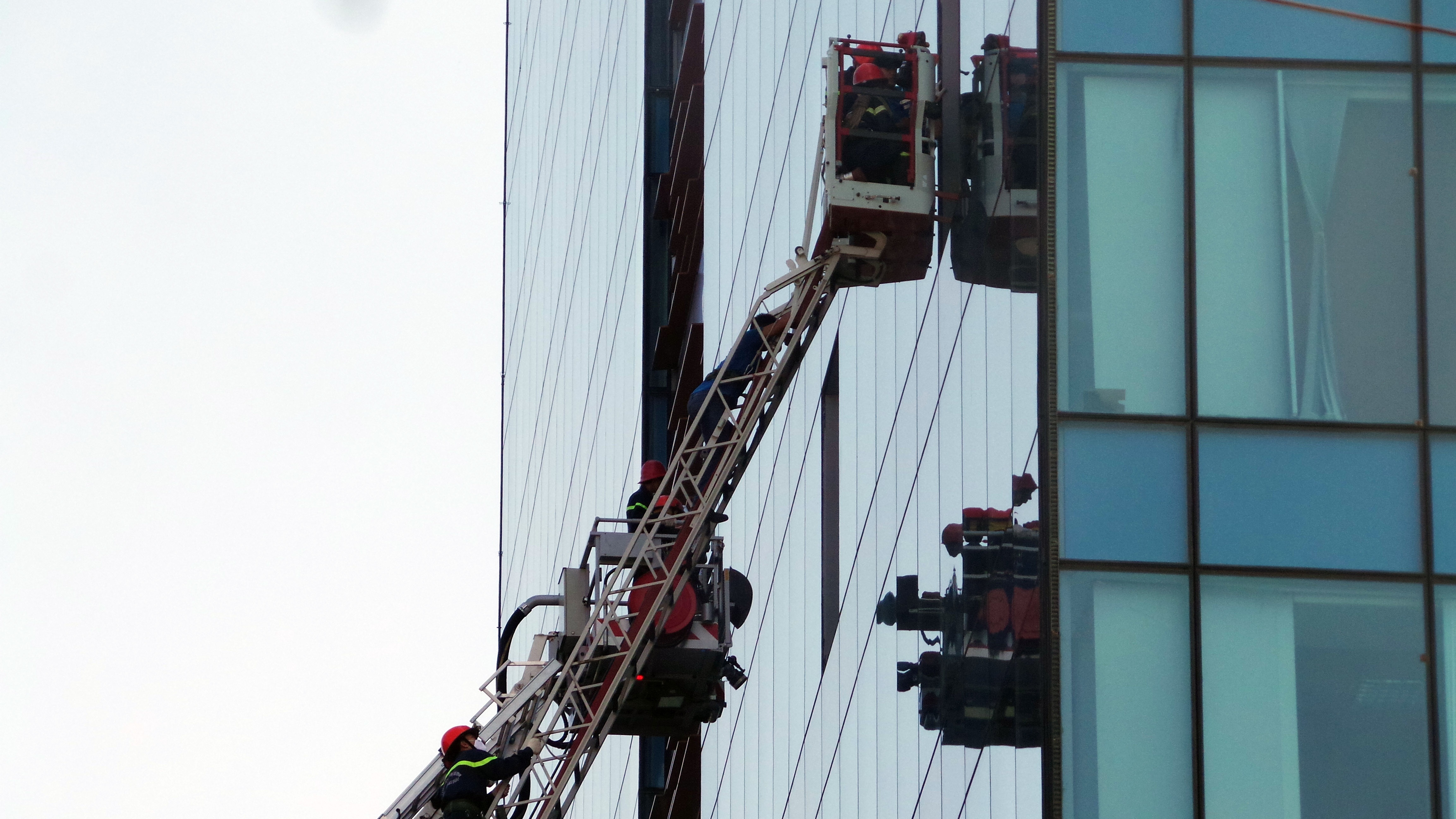| Các xe thang tiếp cận nơi có nạn nhân trong tòa nhà. Từ các thang này, lực lượng cứu hộ sẽ vào tòa nhà tìm kiếm cứu nạn. |