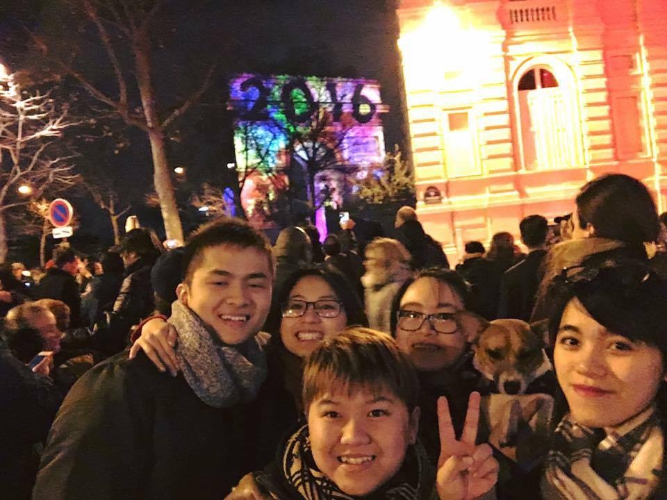| Năm mới của nhóm du học sinh Đại học Luật (Paris, Pháp). Đường khá đông, khó di chuyển nhưng họ vẫn xuống phố để tận hưởng niềm vui và gửi những lời chúc ý nghĩa cho nhau. |