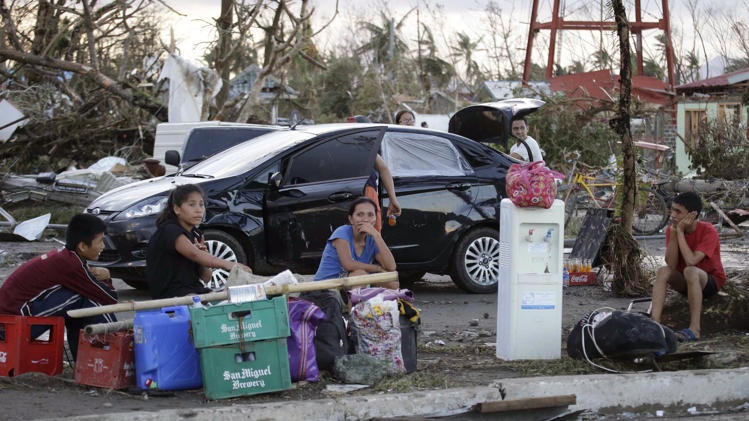 | Những người sống sót sau bão Haiyan ngồi gần đống đổ nát tại thành phố Tacloban, tỉnh Leyte hôm 9/11. Ảnh: AFP. |