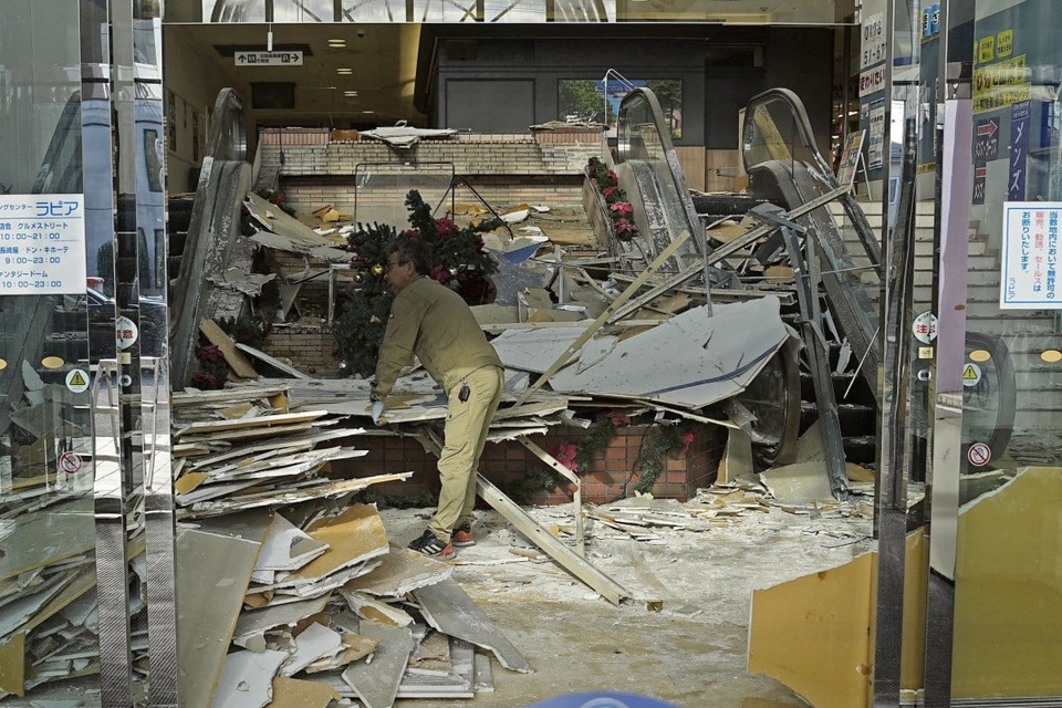 Một công nhân đang dọn dẹp bên trong một trung tâm mua sắm ở Hachinohe, tỉnh Aomori vào thứ Ba. Ảnh: Reuters. |