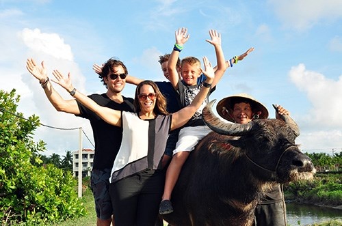 | Bà Carlene Penkett, người Canada cùng chồng và hai con trai rất thích thú với tour du lịch cưỡi trâu ở Hội An. |