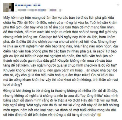 Mặc dù du lịch là trải nghiệm riêng của mỗi người, nhưng quan điểm về “du lịch giá rẻ” vẫn đang kéo theo rất nhiều tranh cãi chưa có hồi kết. Một bên ra sức ủng hộ và ngưỡng mộ những bạn trẻ dám nghĩ, dám làm, dám đi và dám trải nghiệm dù “ví tiền” không thật sự rủng rỉnh.