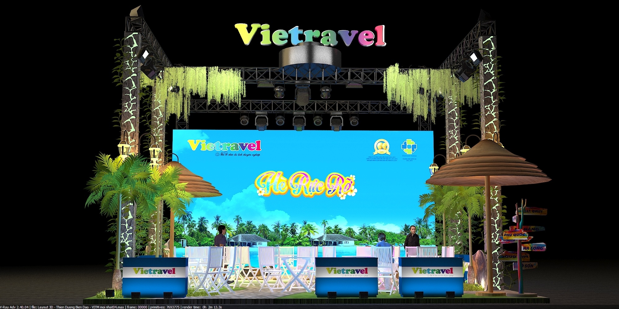 Hội chợ VITM năm nay được tổ chức ngày 14-17/4, trùng đúng vào dịp nghỉ lễ Giỗ tổ Hùng Vương. Do đó, những gia đình không kịp sắp xếp thời gian đi du lịch có thể coi hội chợ là điểm vui chơi cuối tuần lý tưởng trong kỳ nghỉ lễ. Hòa chung chủ đề Việt Nam - thiên đường biển đảo, gian hàng Vietravel năm nay tái hiện lại một không gian resort biển đẹp, hiện đại, trẻ trung nhưng vẫn mang đậm dấu ấn kiến trúc Việt.