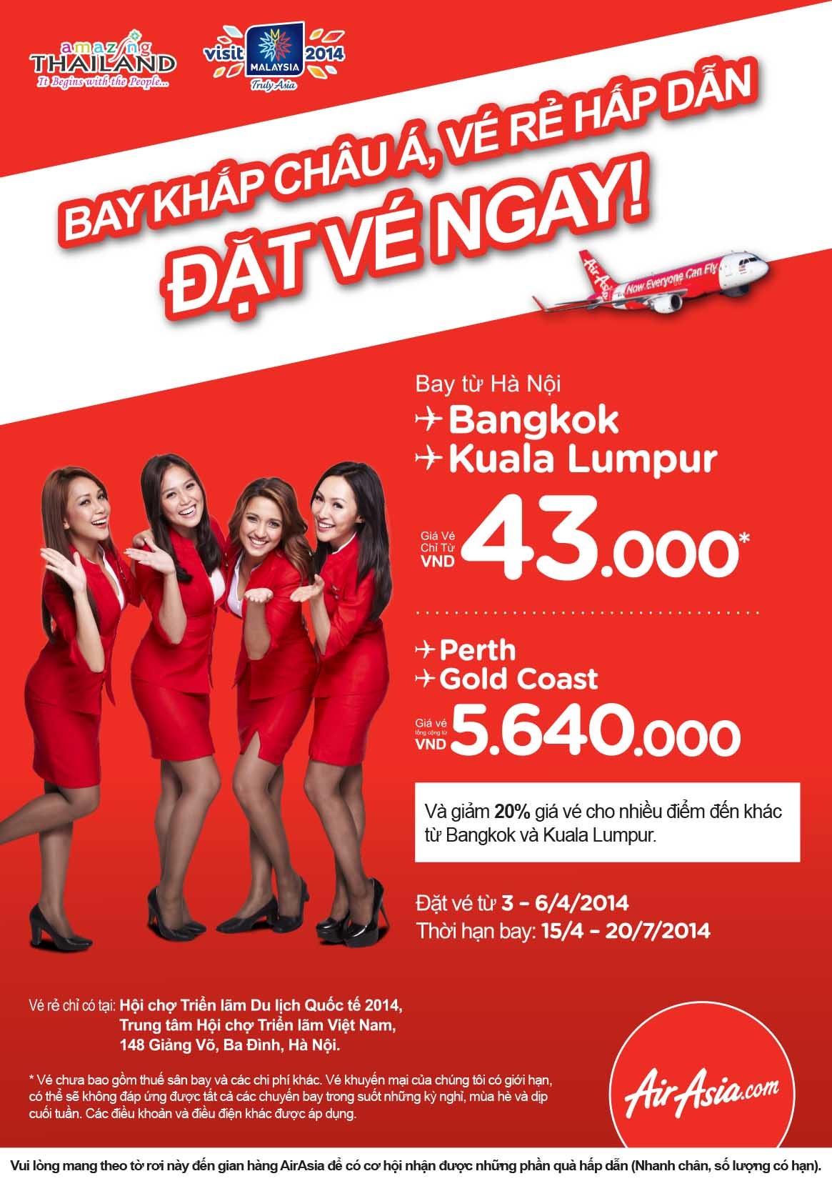 Đây là chương trình được thực hiện nhân dịp hội chợ du lịch quốc tế diễn ra tại trung tâm triển lãm Giảng Võ (Hà Nội) từ ngày 3-6/4. Khách đến tham quan tại đây có thể đặt vé cho đường bay từ Hà Nội đến Bangkok (Thái Lan), Kuala Lumpur (Malaysia) với mức giá từ 43.000 đồng/ chiều (chưa gồm thuế và phụ phí sân bay) hoặc đến Perth, Gold Coast (Úc) với giá từ 5,64 triệu đồng/ chiều (chưa gồm thuế và phụ phí sân bay). Các vé khuyến mãi đặt trong thời gian này sẽ áp dụng cho các chuyến bay khởi hành từ 15/4-20/7.