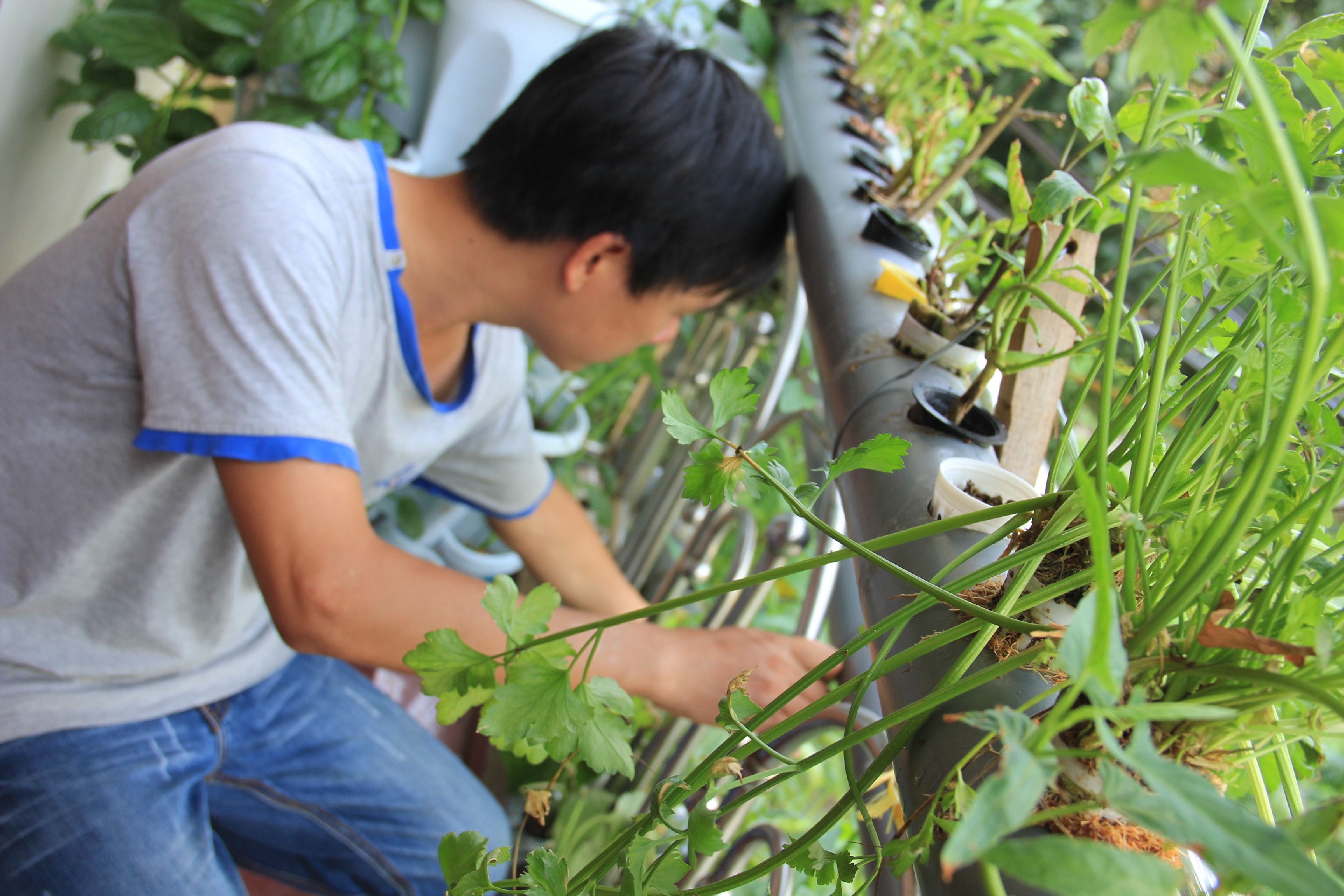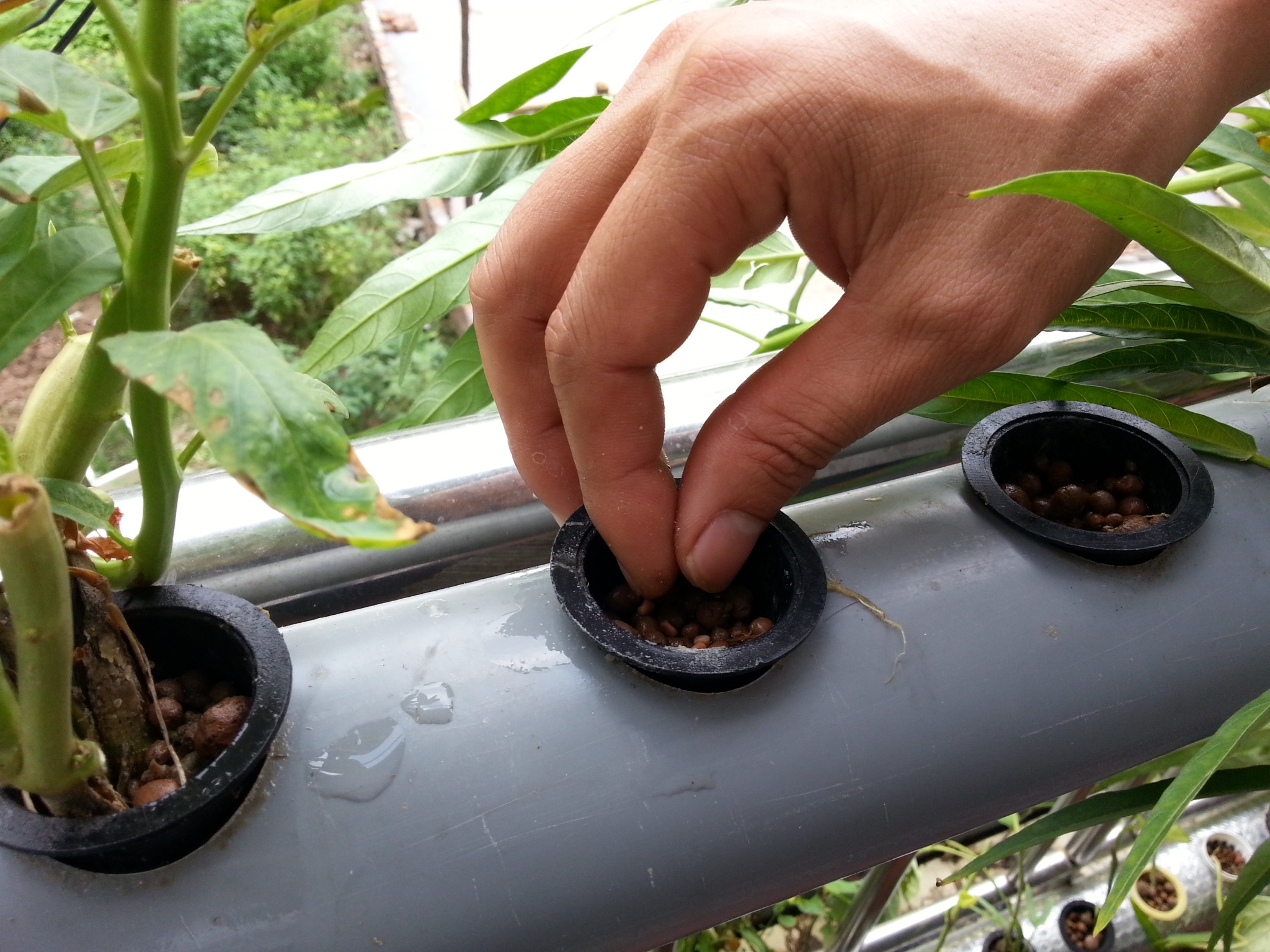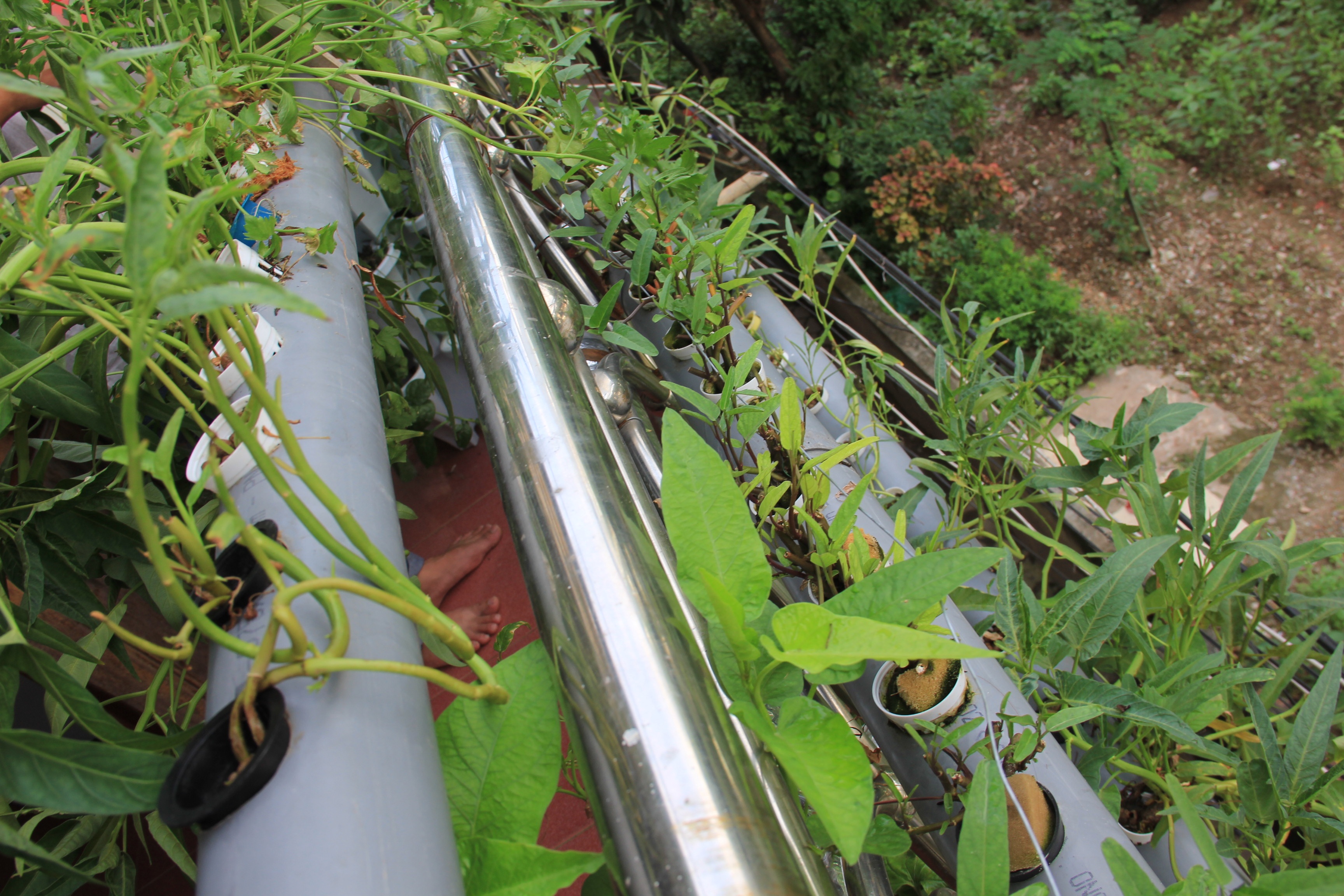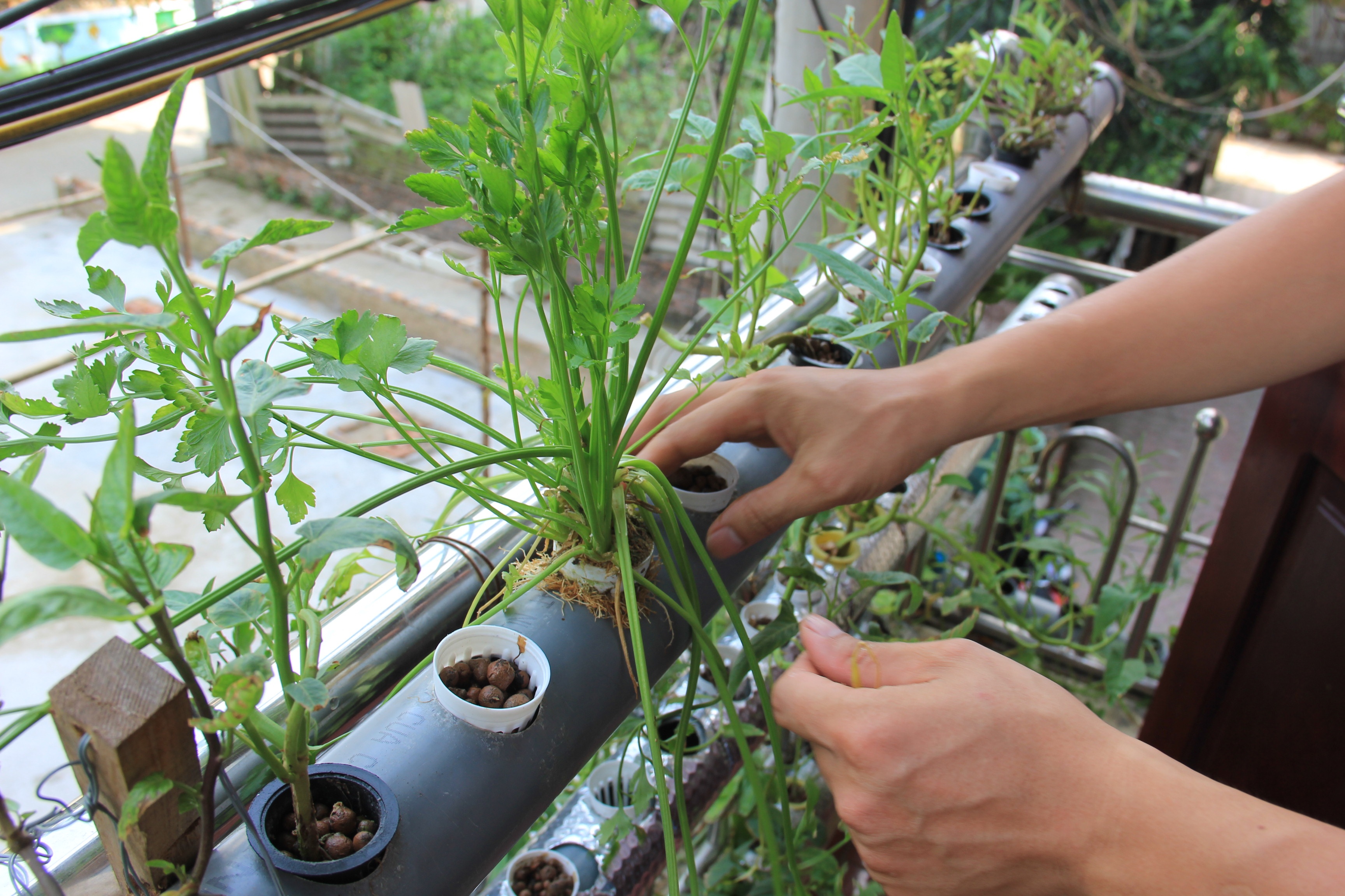 Điều đặc biệt là vườn rau này được trồng trên những ống nhựa to chừng 10 cm, và có thể di chuyển bất cứ lúc nào. Đây là phương pháp trồng rau thuỷ canh tĩnh, hay còn gọi là hệ thống trồng rau bán thuỷ canh hồi lưu, cây sinh trưởng và phát triển nhờ hệ thống tuần hoàn dinh dưỡng.