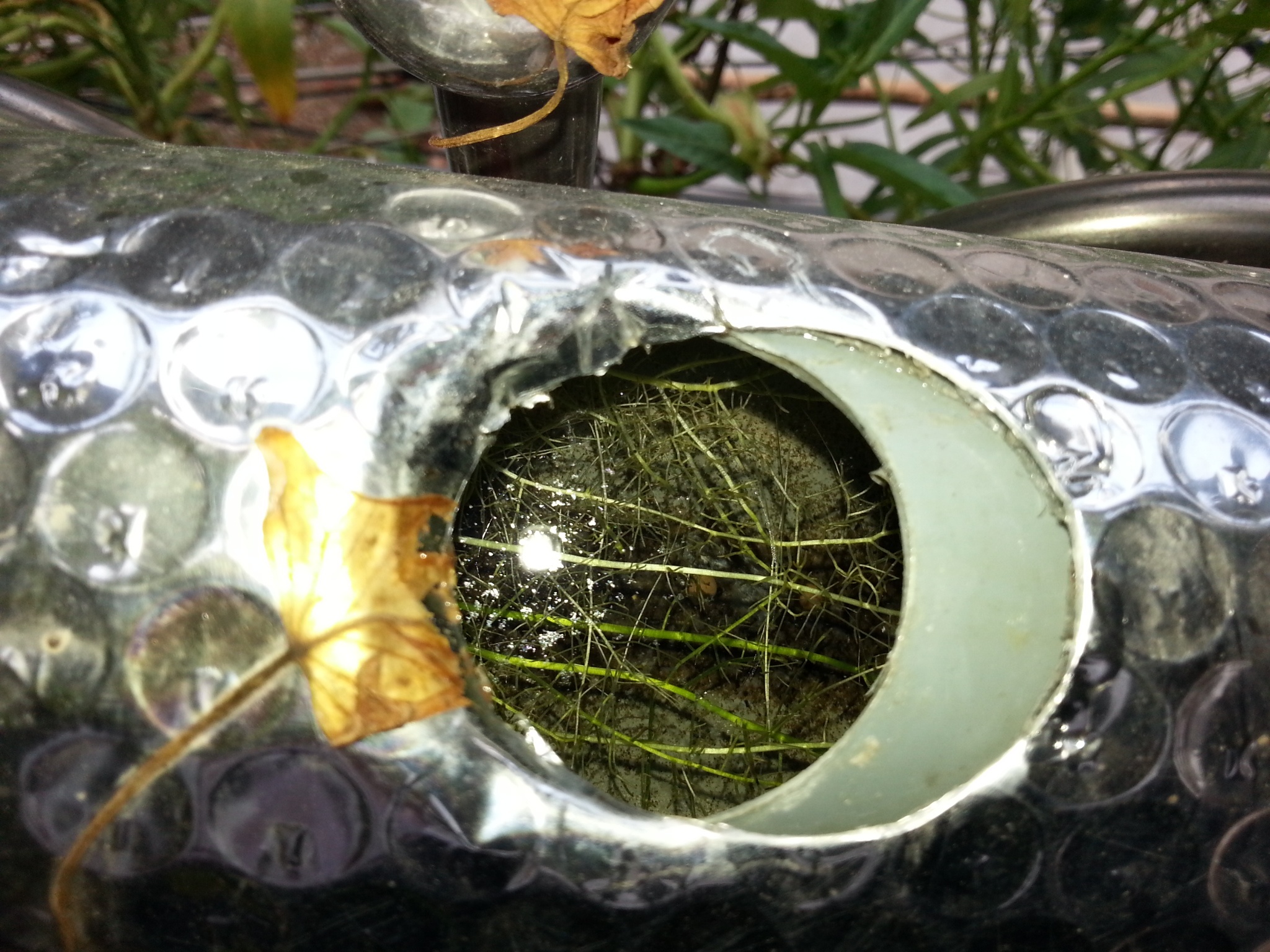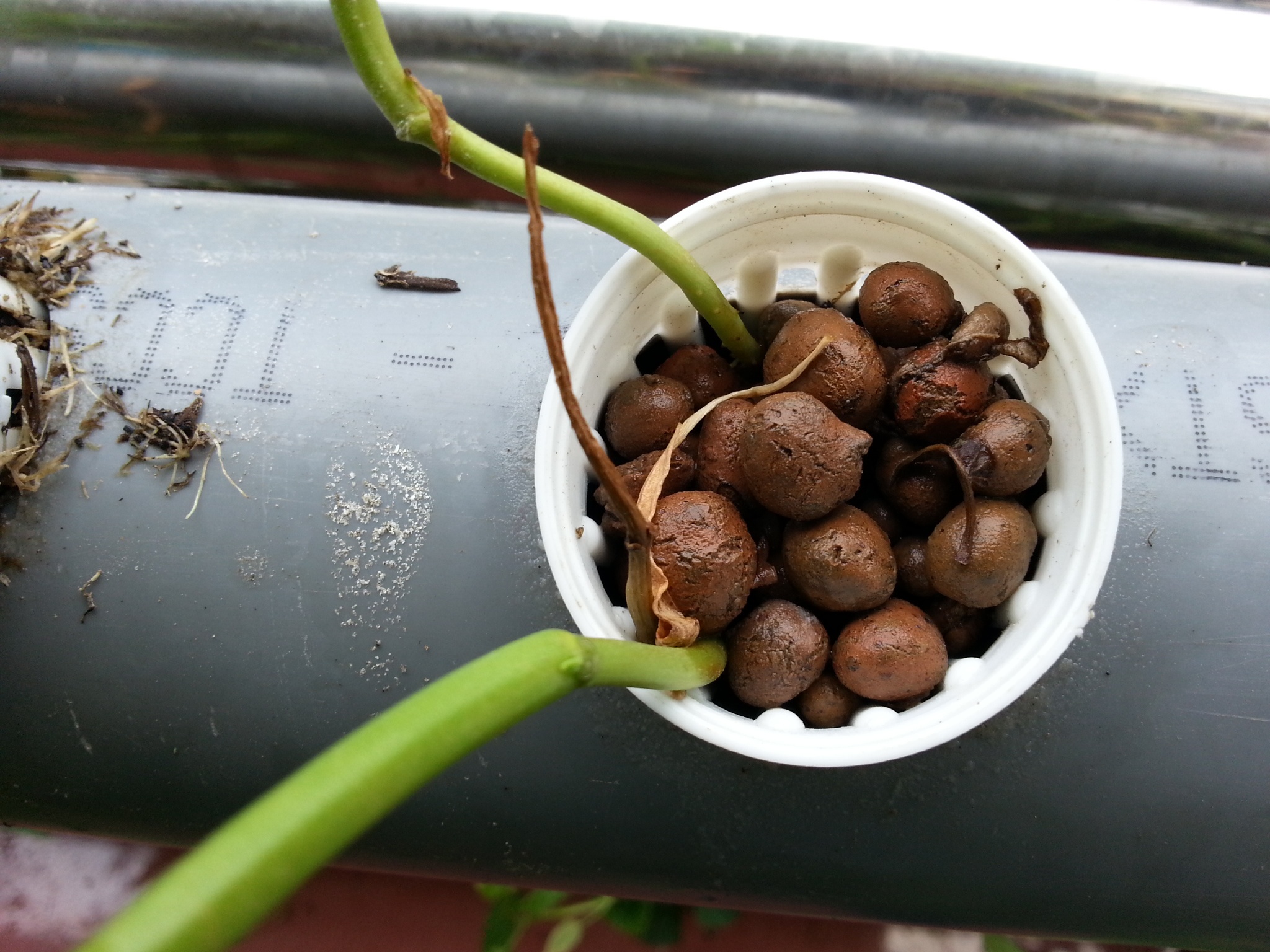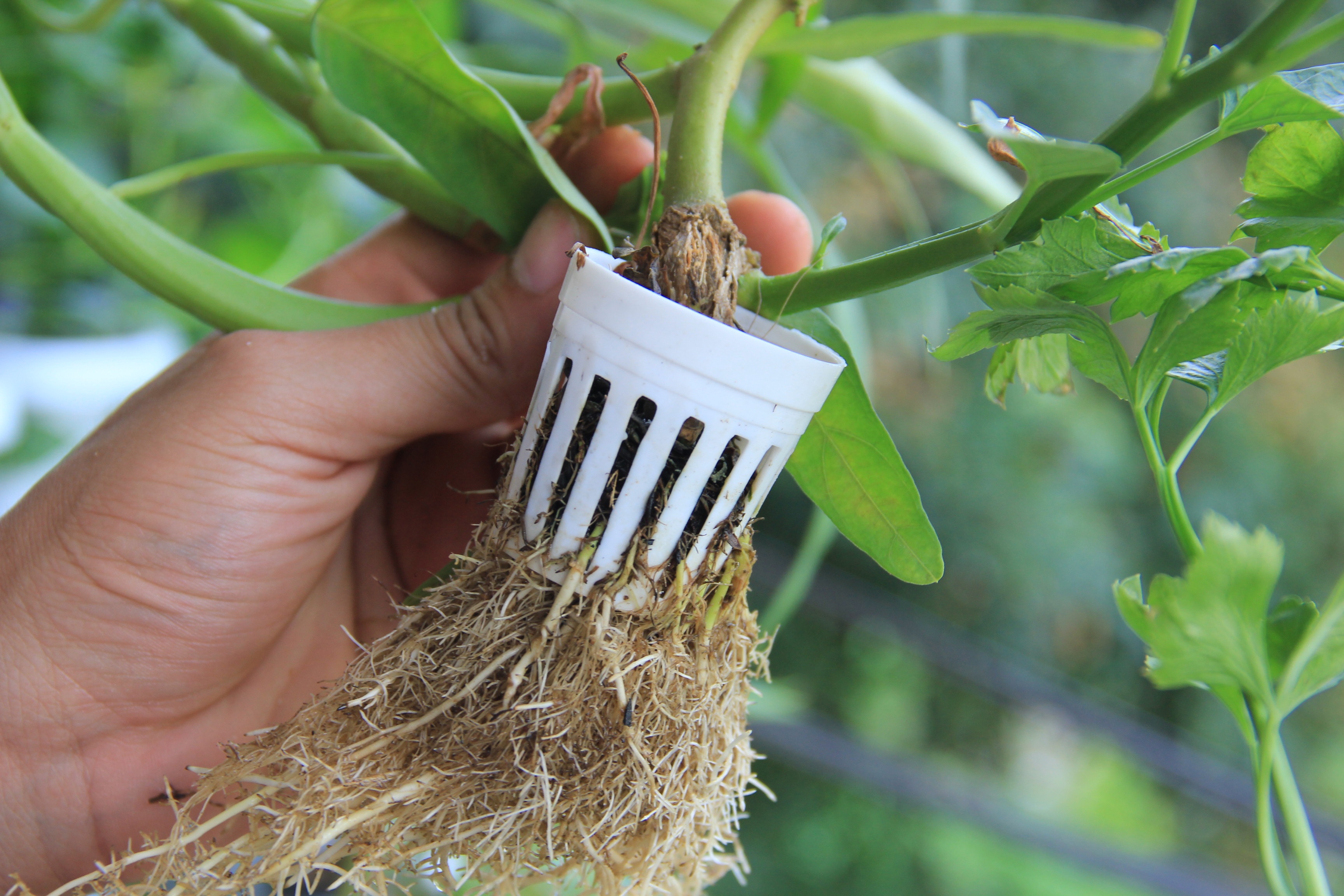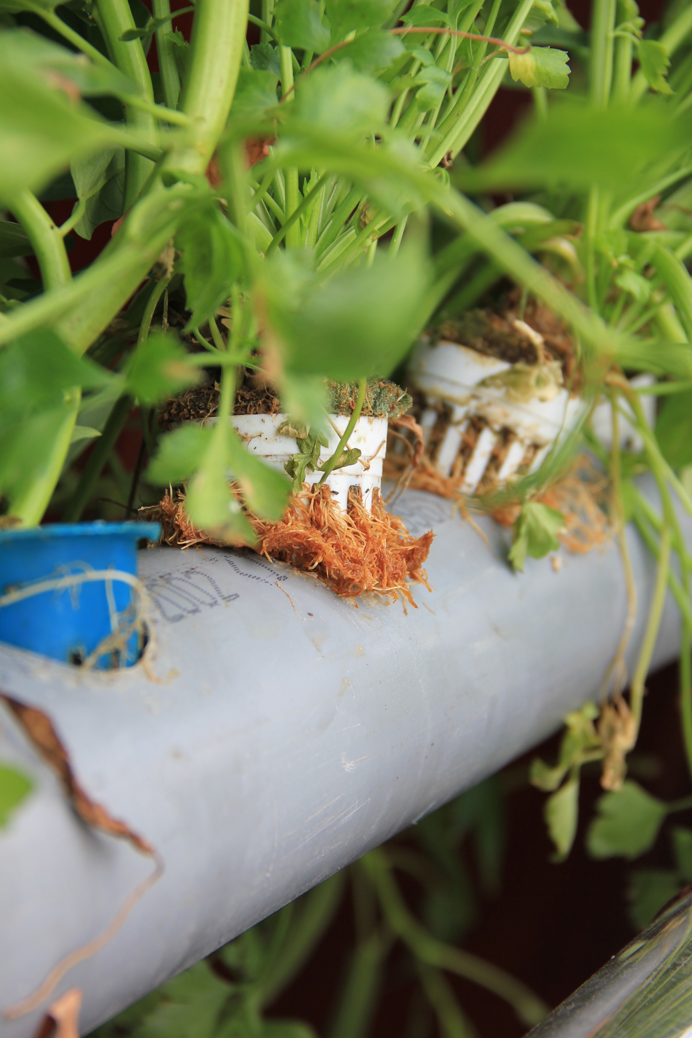 | Rễ cây mọc dài, đâm ngang qua các khe giỏ trồng xuống phía dưới ống nhựa, và không hề bẩn. |