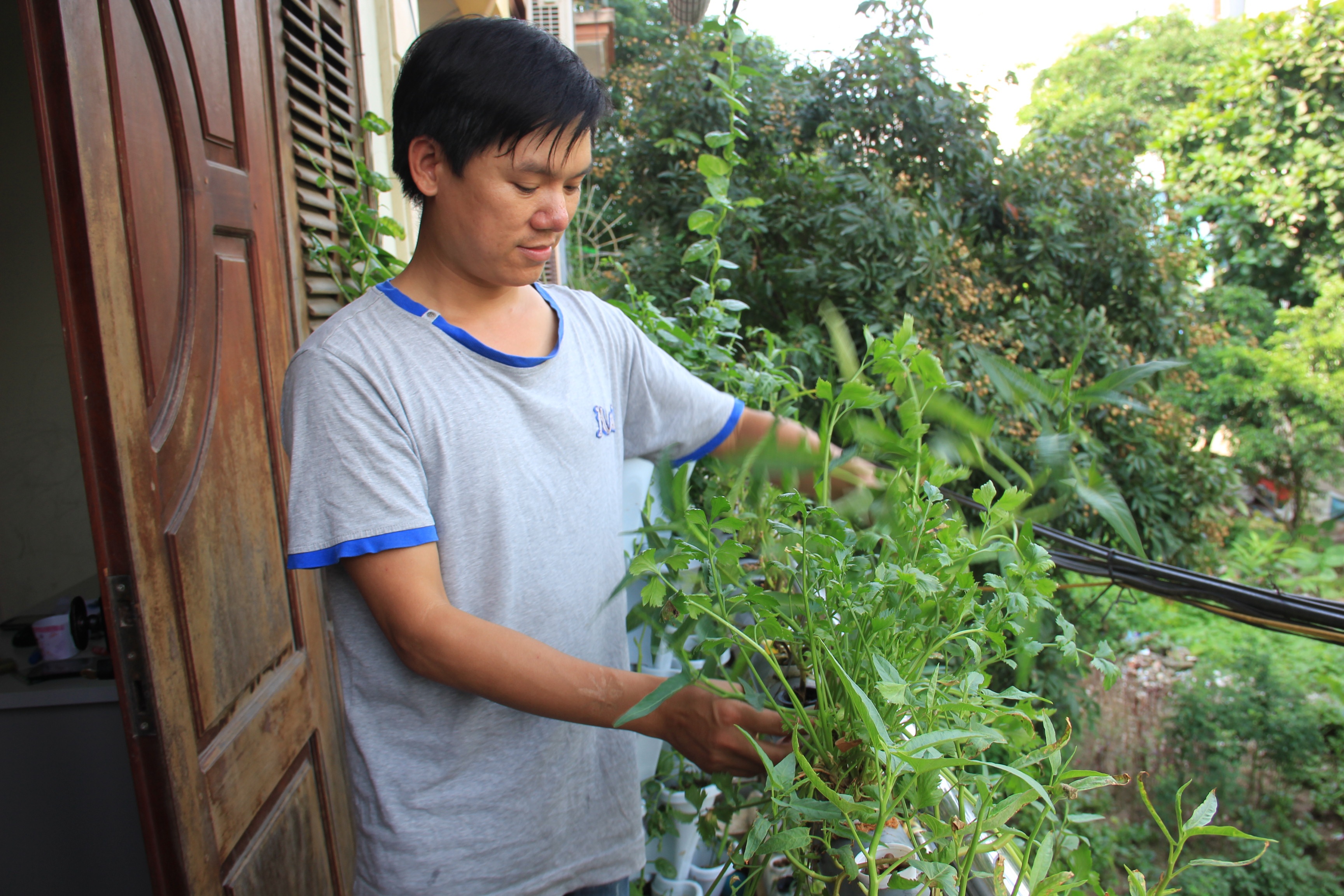 | Do diện tích căn hộ nhỏ, đất trồng không có nên anh Biết tận dụng ban công rộng chưa đầy 2 m2 để trồng rau ăn hàng ngày. |