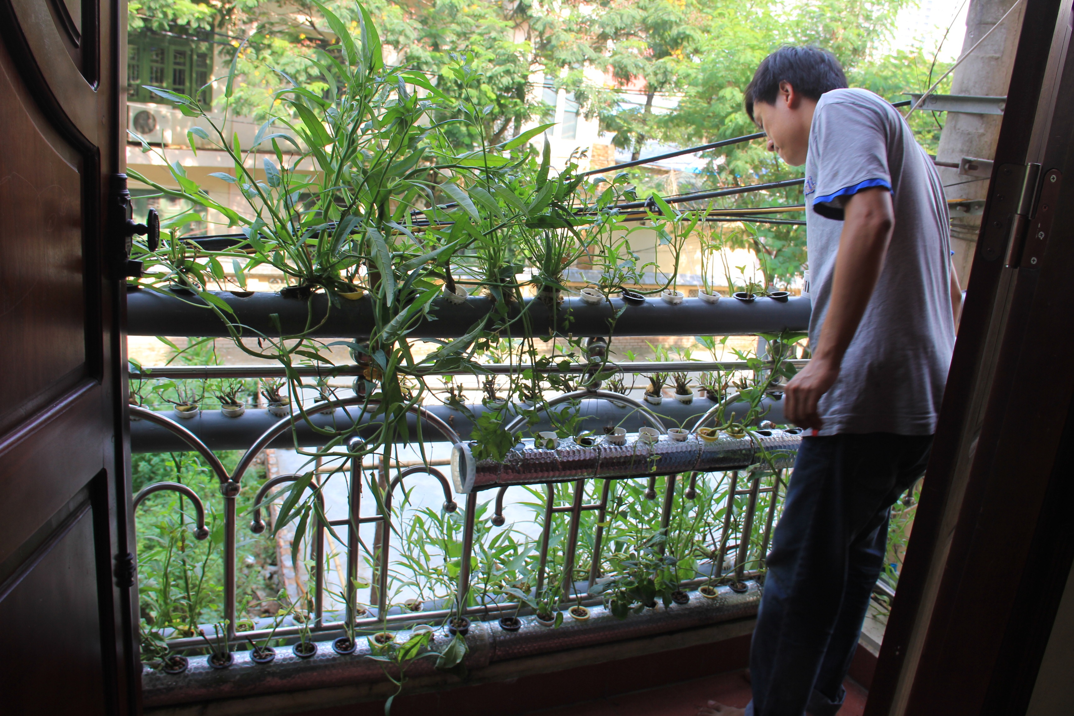 Ban công chỉ rộng chưa đầy 2 m2 nhưng nhờ trồng rau theo hệ thống hồi lưu, gia đình anh Nguyễn Hiểu Biết (Mai Dịch, Hà Nội) có đủ rau sạch ăn hàng ngày.