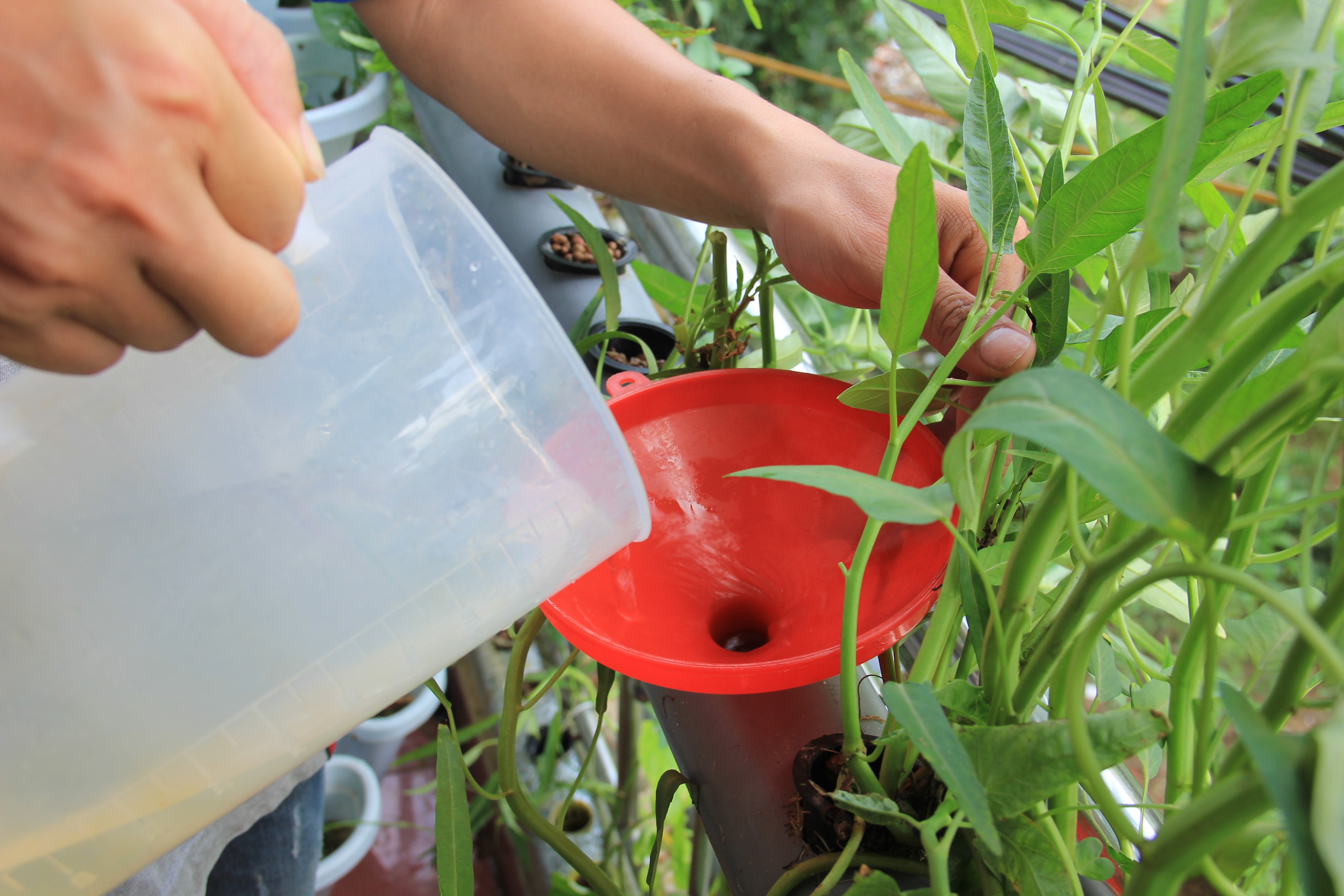 Khi cần bổ sung dinh dưỡng có thể tháo một giỏ rau khỏi ống để đổ nước. Dụng cụ trồng rau chỉ cần một chiếc ca và phễu để đổ nước bổ sung dinh dưỡng.