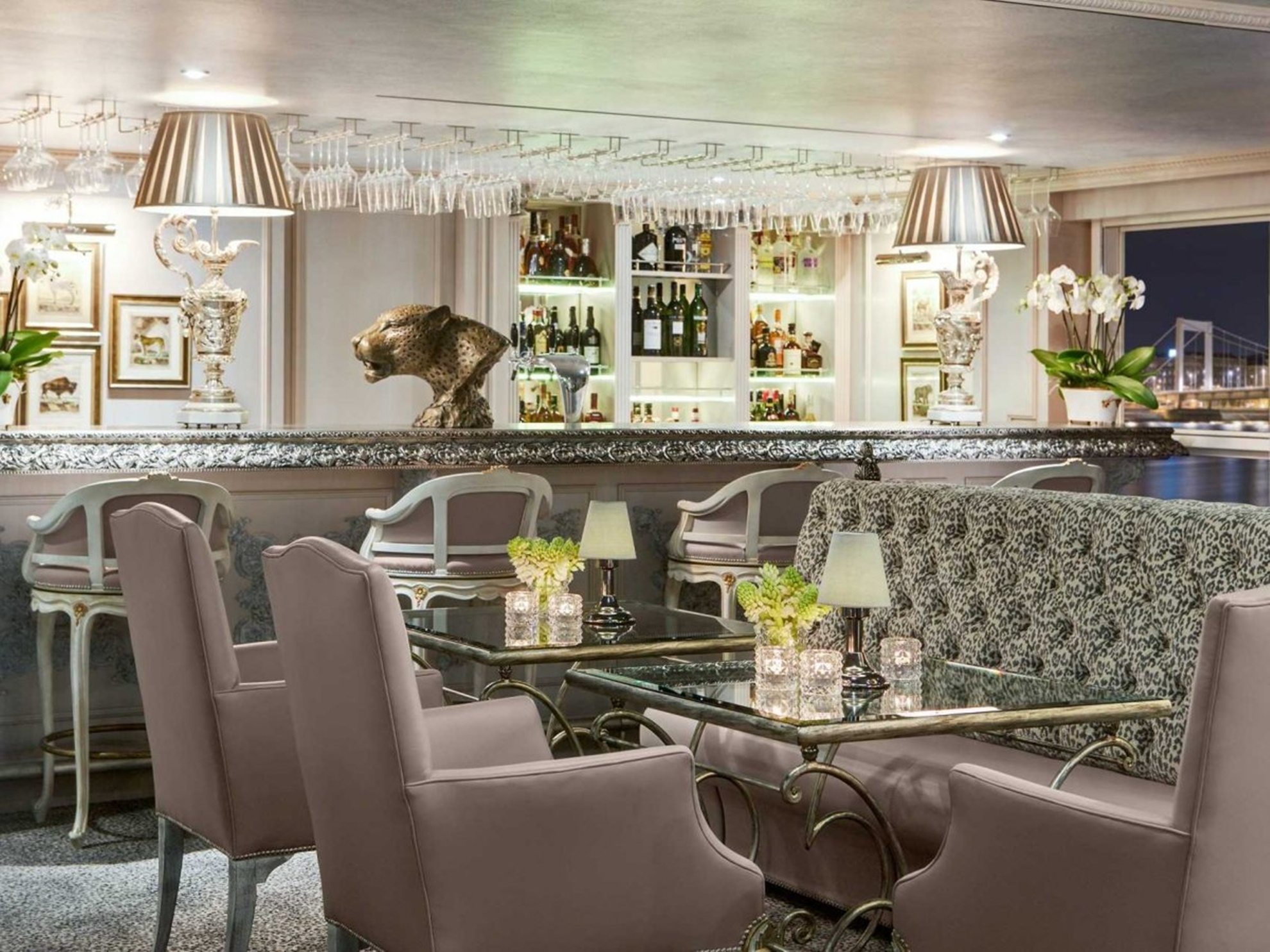 Quầy bar với những chiếc ghế phong cách cổ, là nơi lý tưởng để vừa nhâm nhi tách trà, vừa thưởng ngoạn cảnh sông. |