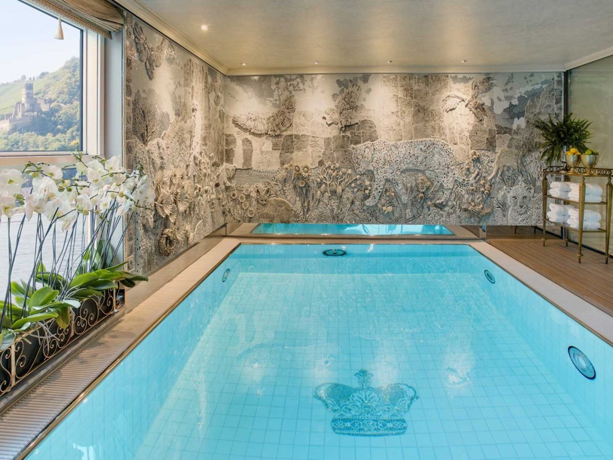 Khu bể bơi trên du thuyền với bức tường ấn tượng.