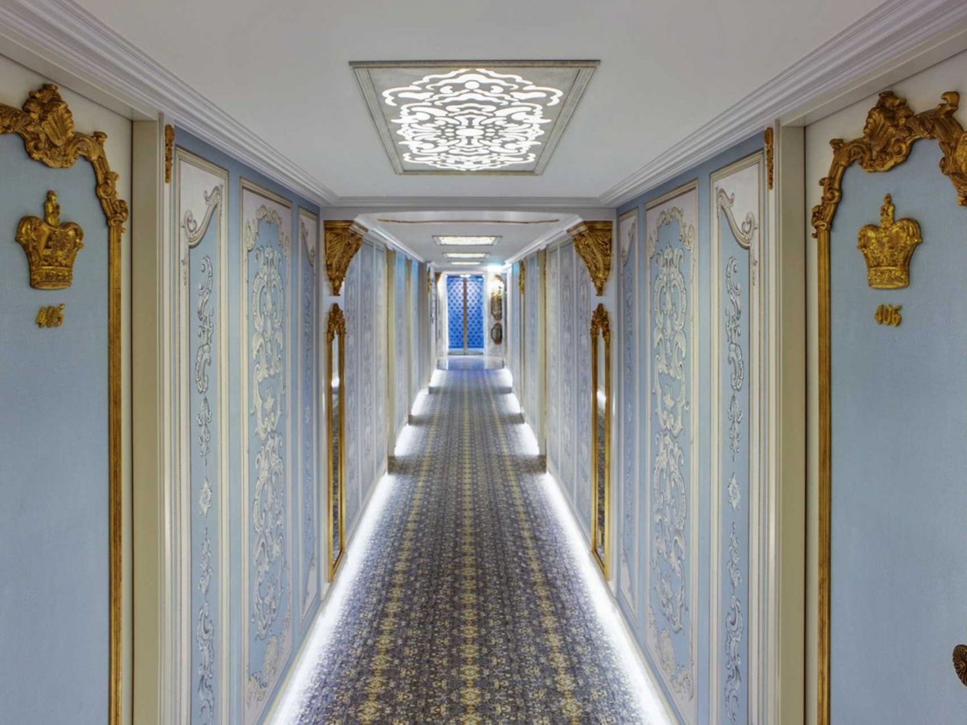 Dãy hành lang sang trọng dẫn tới các phòng ngủ.