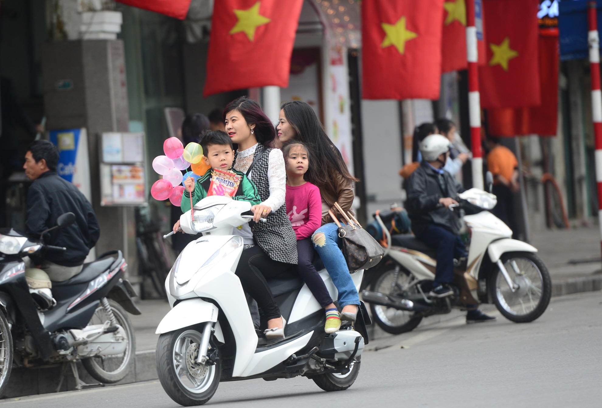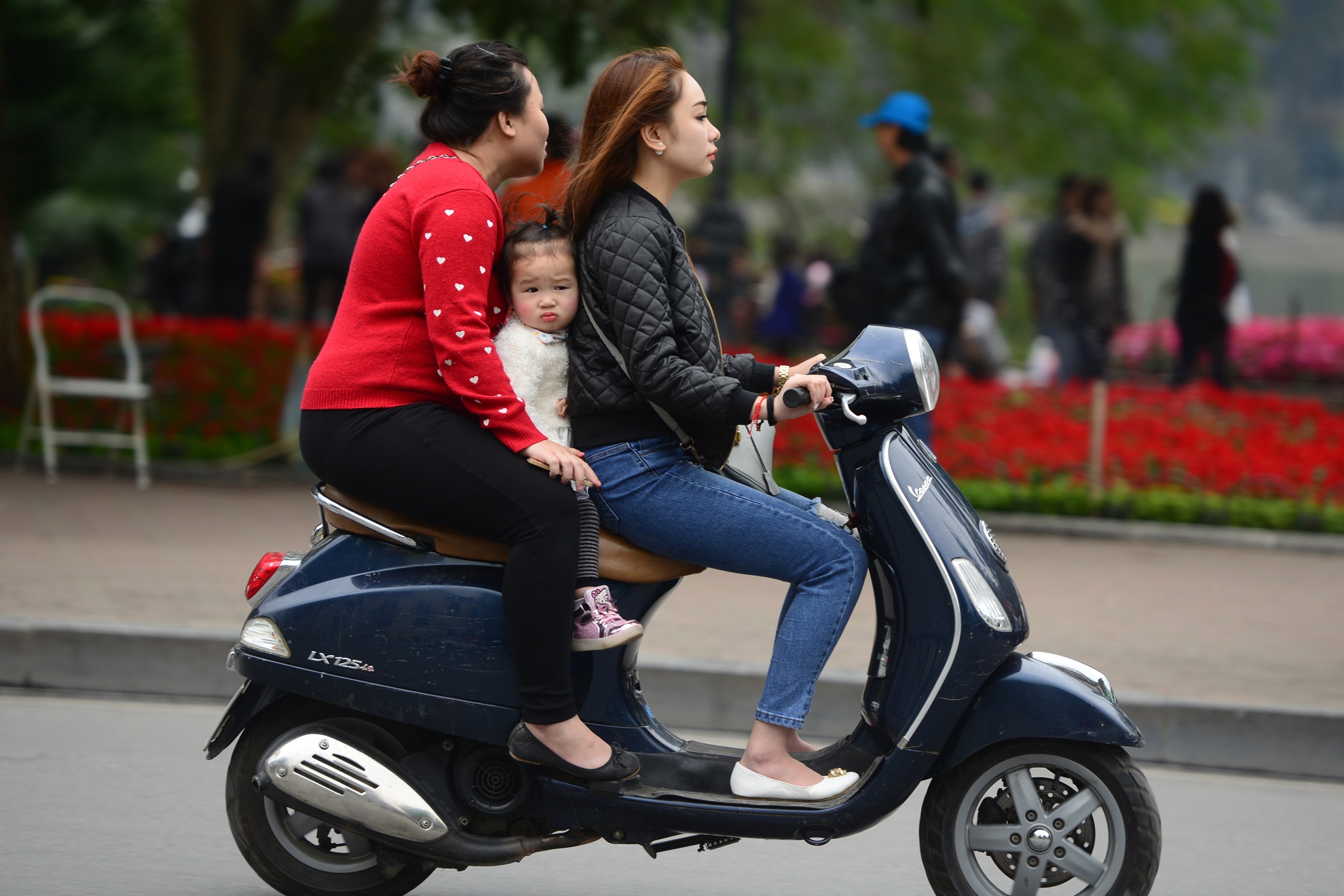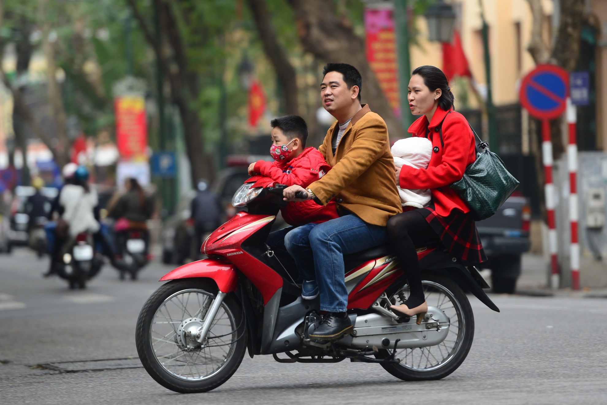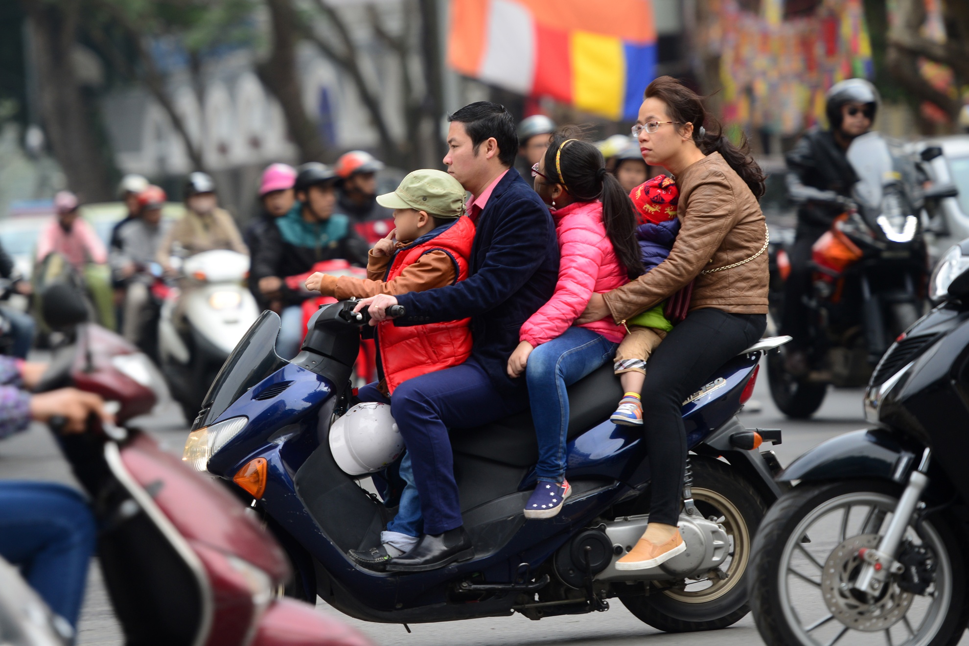 | Nhiều gia đình không đội mũ bảo hiểm khi đi xe máy và chở quá số người quy định. |