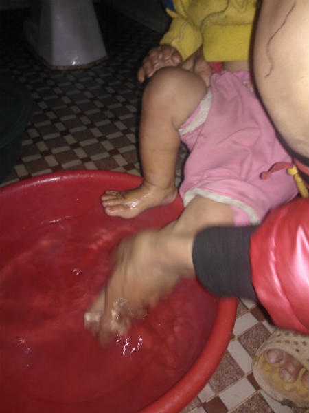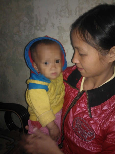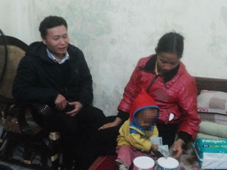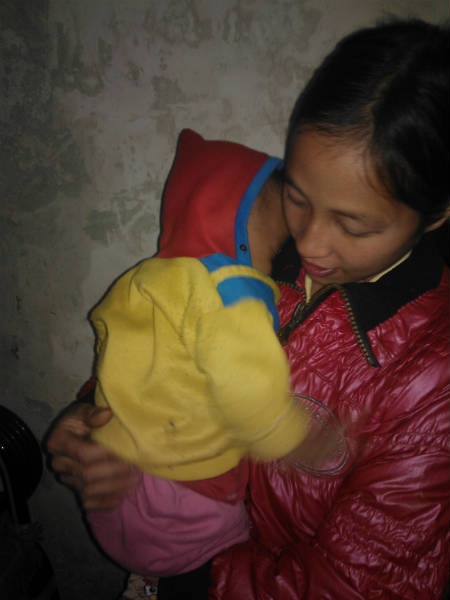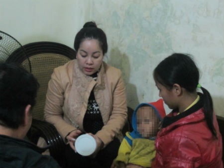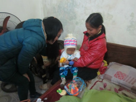 Trong tiết trời mưa lạnh như cắt da của Hà Nội, hai mẹ con chị Sông ở bản Kim Thạch (xã Minh Ngọc, huyện Bắc Mê, tỉnh Hà Giang) chỉ phong phanh 1 tà áo mỏng. Xuống khỏi xe, bàn chân cả 2 mẹ con đều tím tái. Bé X. mặc ngoài bằng bộ quần áo vô cùng nhem nhuốc, tay chân vẫn lấm lem. Thỉnh thoảng bé lại khóc dé lên vì lạ người.